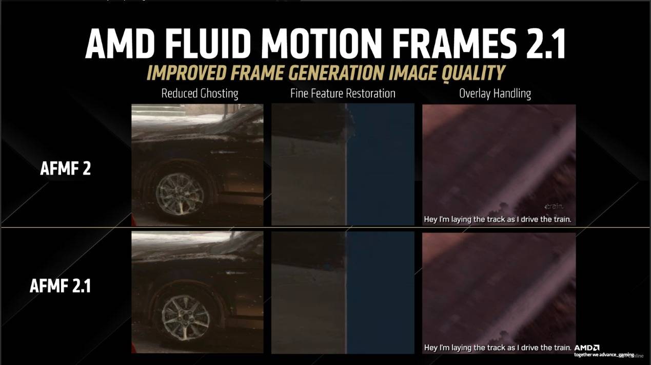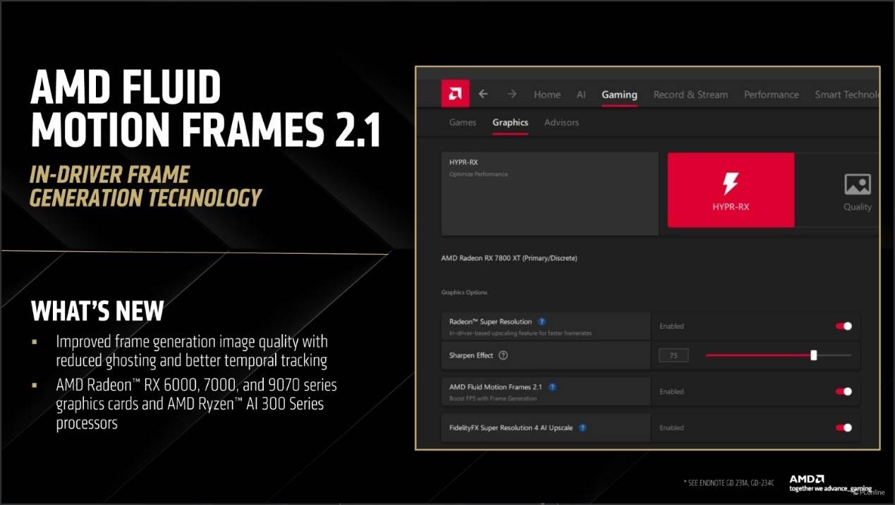 此次AFMF将更新至2.1版本,相比前代能够大幅减少重影以及更好的判定帧生成的时间,从而提供更好的游戏图像质量。当然,还有一个重点是,FSR 4是RDNA 4架构显卡独享,而AFMF 2.1技术则可以适用于RADEON RX 6000、7000、9070系列显卡甚至是AMD Ryzen AI 300系列CPU。