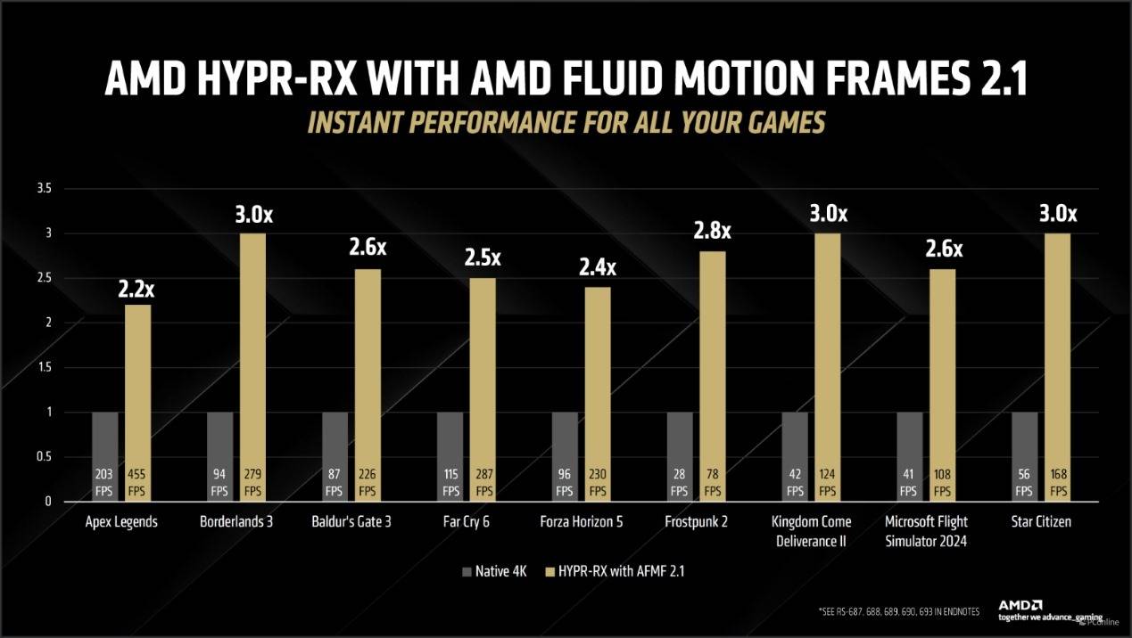 至于性能方面,根据AMD的数据,在RADEON RX 9070 XT GPU上启用HYPR-RX with Fluid Motion Frames 2.1时,将获得高达3倍的性能提升。