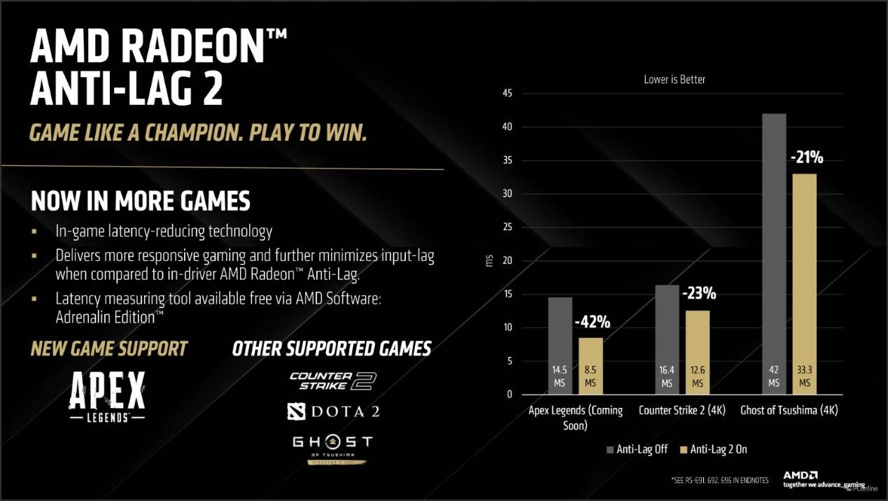 同时延迟控制也非常合理,搭配使用Anti-Lag 2,可以在即将推出的游戏(如Apex Legends)中减少高达42%的延迟。