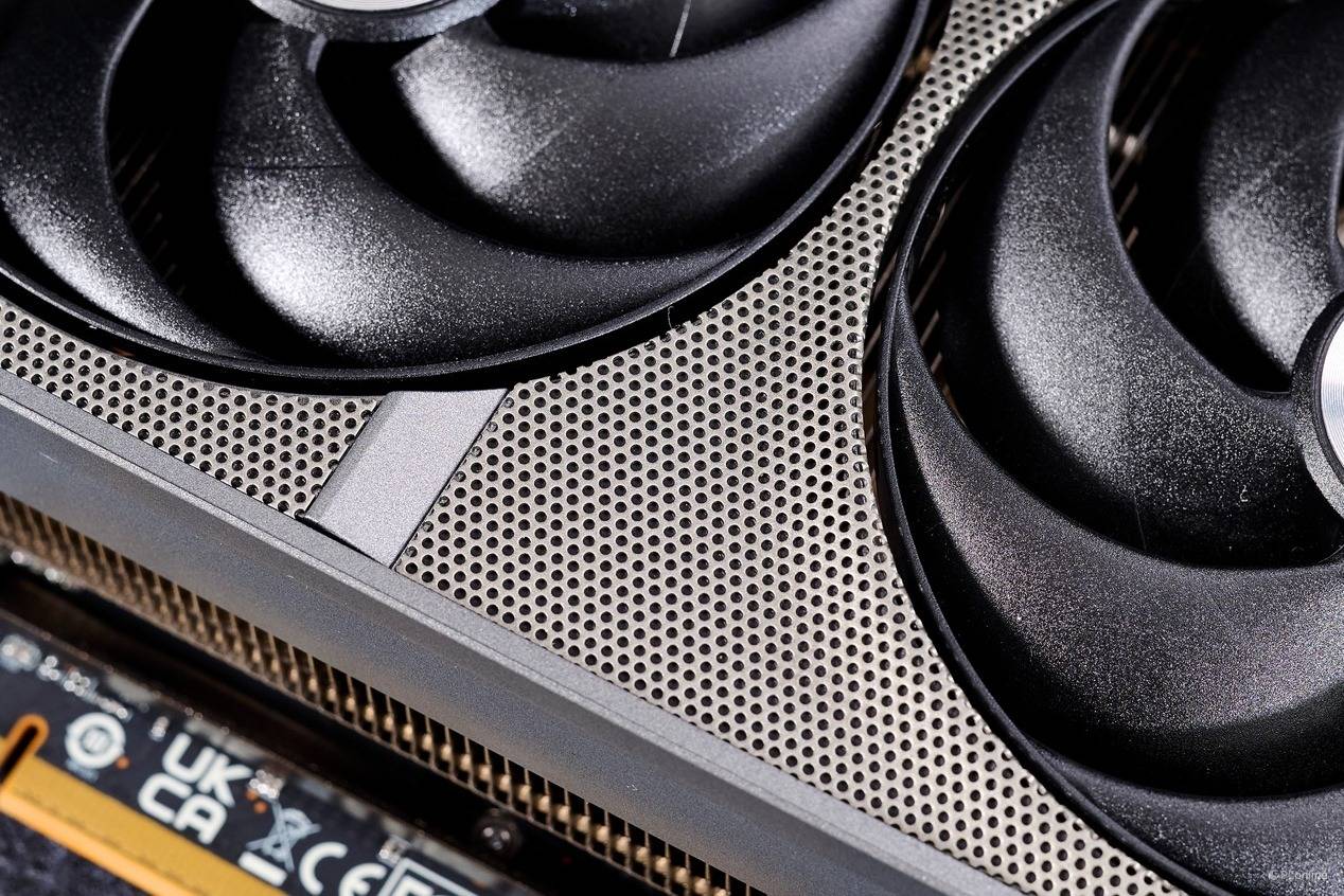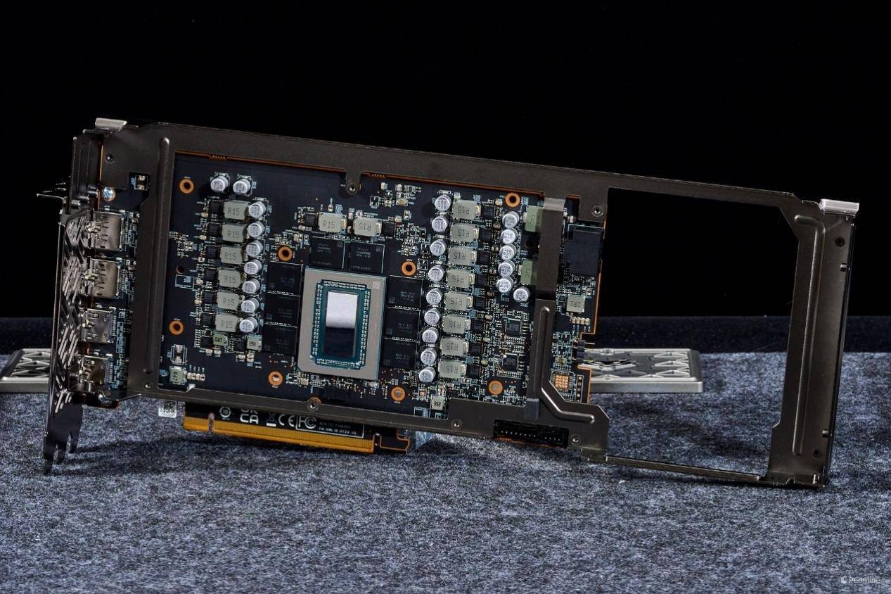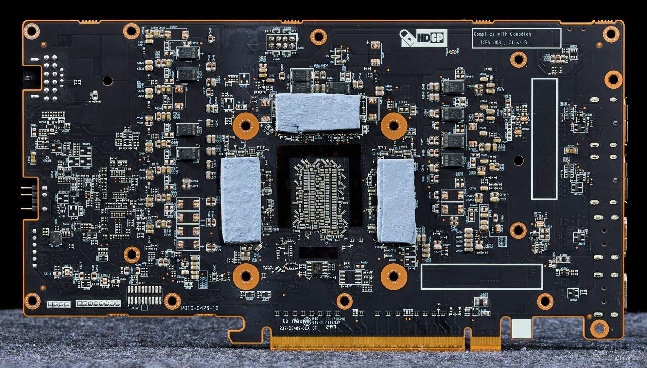 翻转显卡,让我们看看它的背面设计,这也是整张显卡中我最喜欢的部分。你可能觉得平平无奇,不过是像其他显卡一样,左侧镂空右侧金属散热的设计。