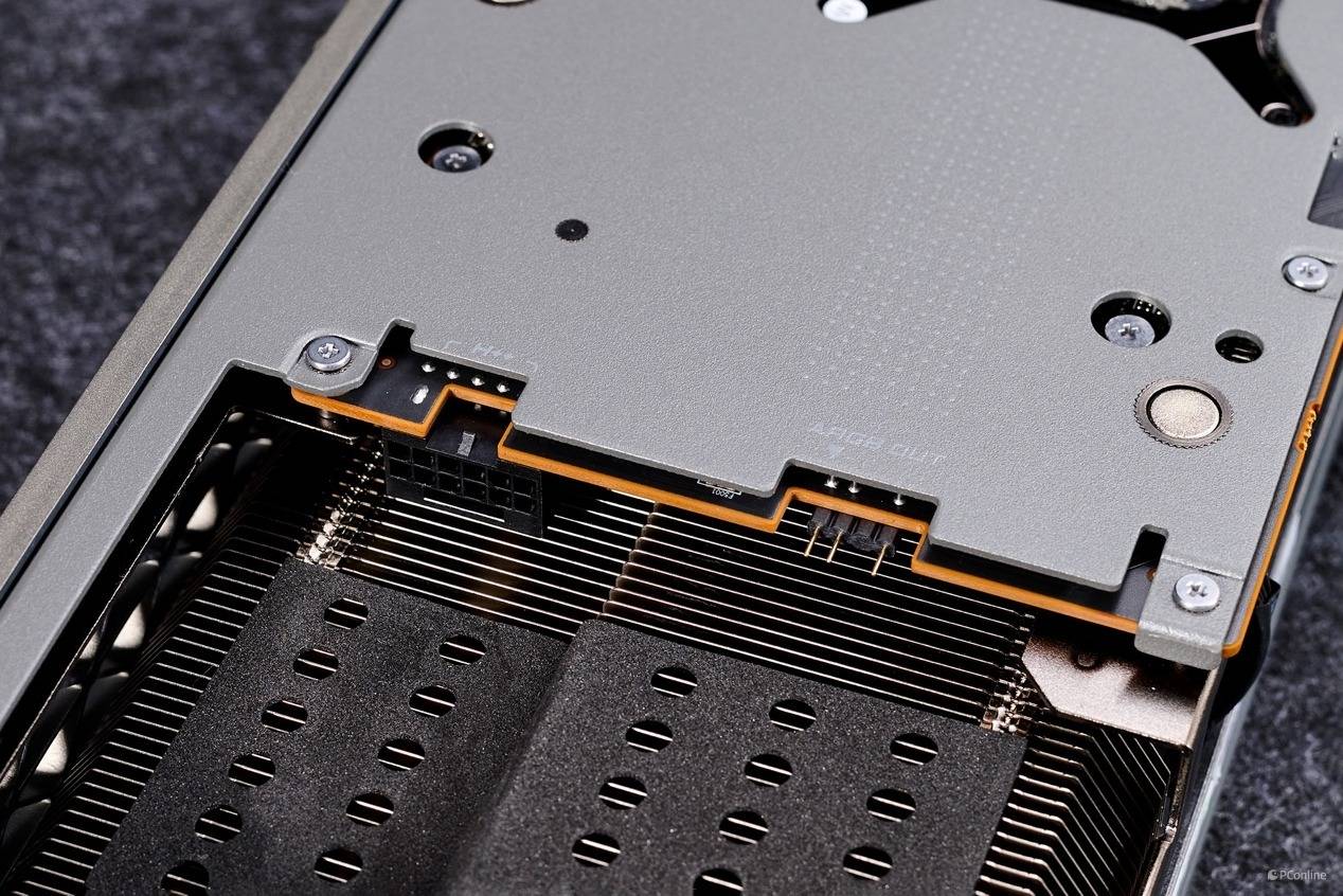 放大看细节,其实镂空的部分内还隐藏了电源接口。这款显卡采用了背插式接口,用户完成安装后,可在机箱外侧尽情欣赏没有被线缆遮挡的显卡。