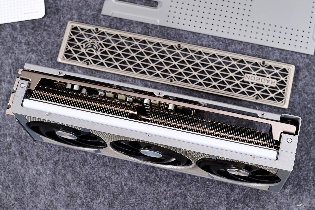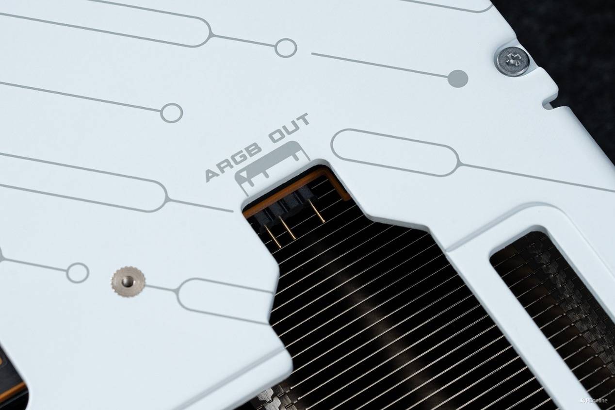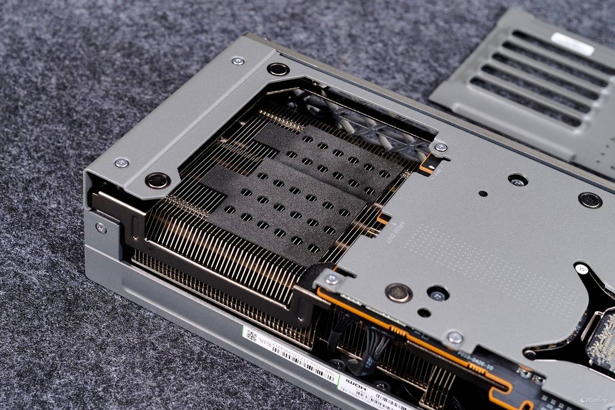 取下磁吸背板才是真正的显卡背部外观。这里最直观的改变就是相比较于传统显卡的镂空设计,这款显卡似乎更加大胆,镂空的面积更大,可以直接看到内部的散热鳍片。