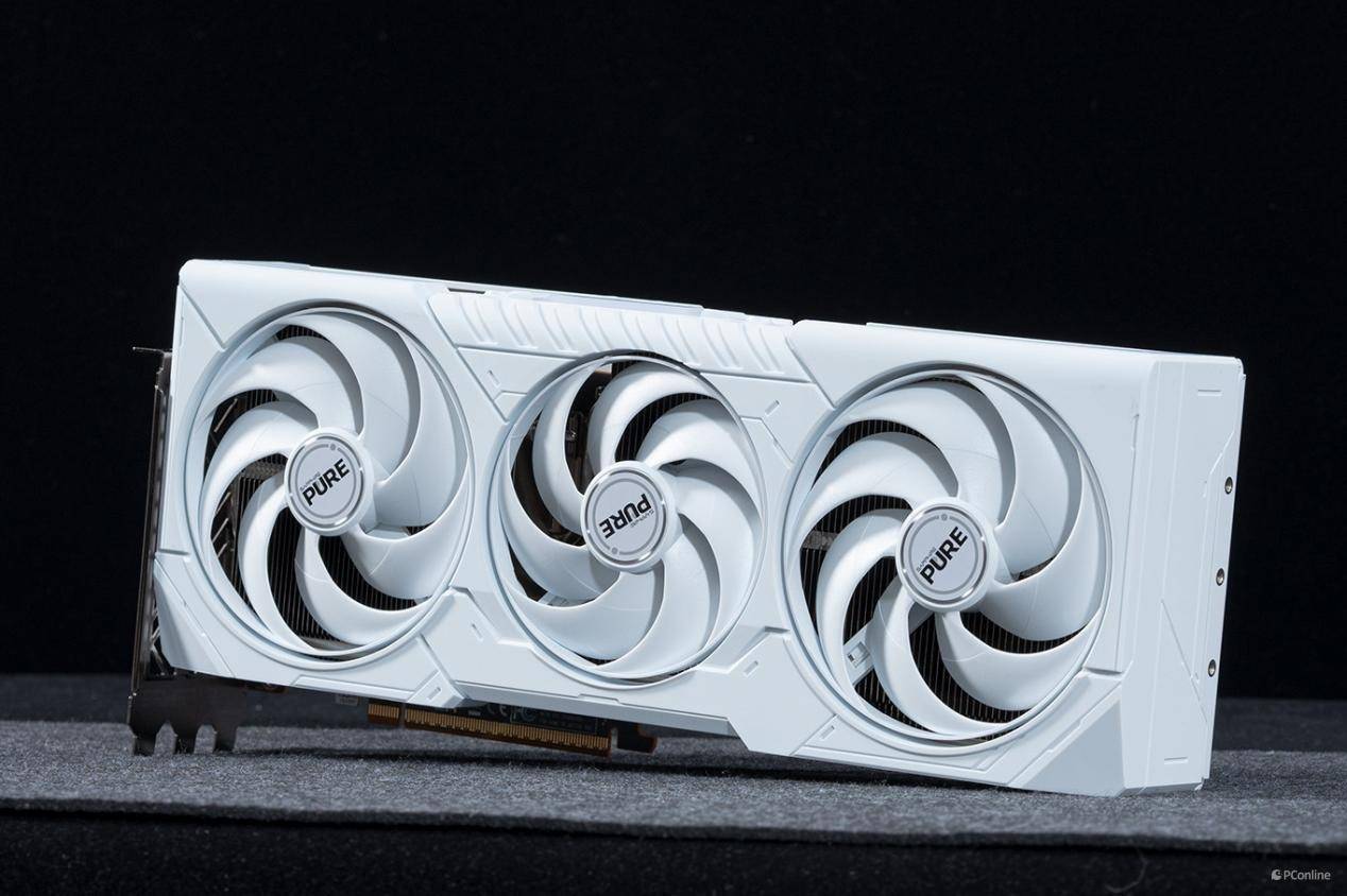 蓝宝石PURE极地AMD RADEON RX 9070的外观还是非常养眼的,整张显卡采用优雅的极地白作为主打色,同时在正面的导风罩上还加入了不少机甲风格的斜切纹路,将科技与美学完美的融合,犹如蓄势待发的极地武士一般。