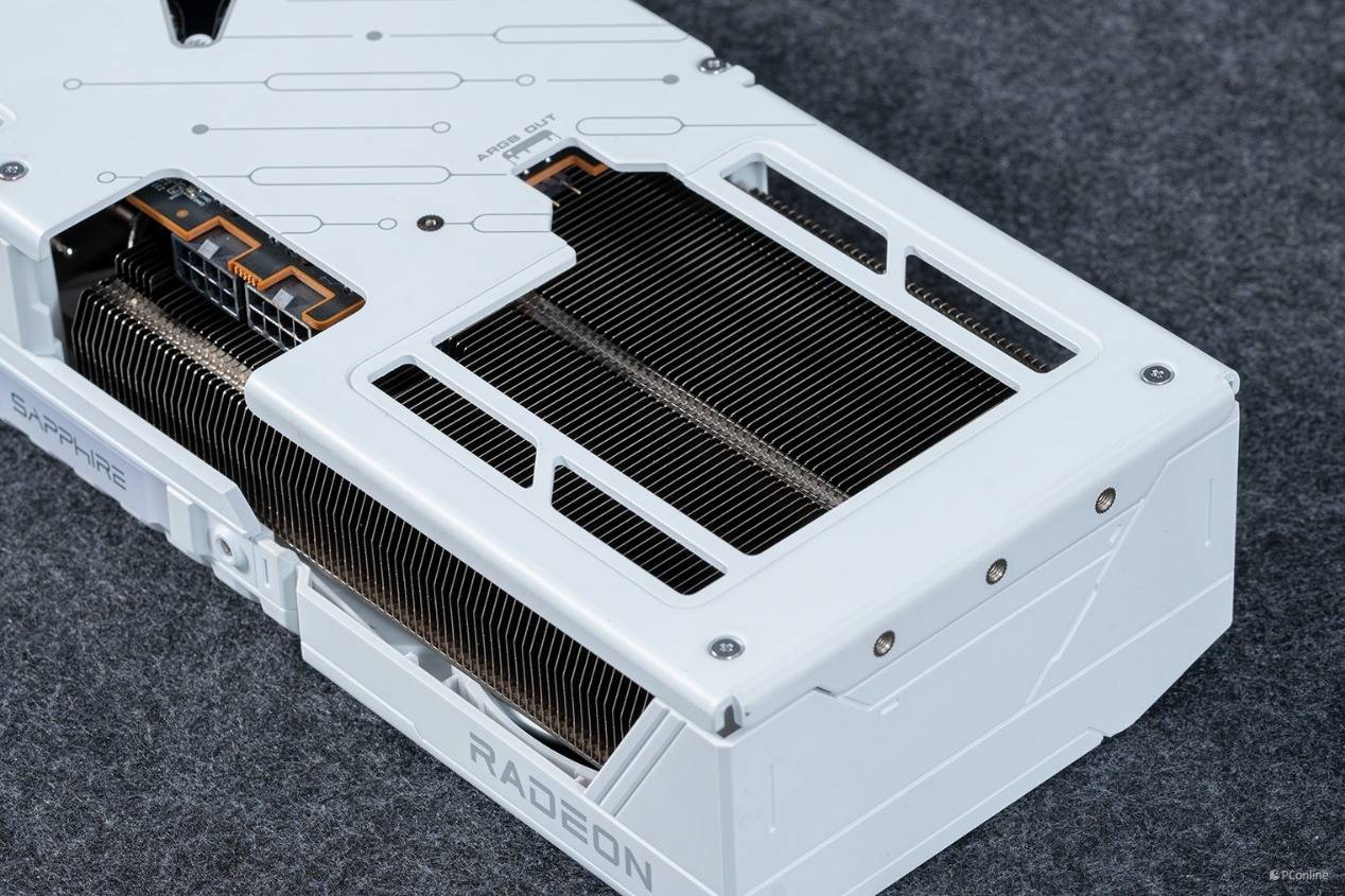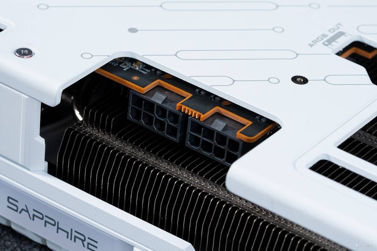 顶部还有显卡的供电接口,不同于蓝宝石NiTRO+氮动AMD RADEON RX 9070 XT的全新电源接口,蓝宝石PURE极地AMD RADEON RX 9070采用的是传统的双8PIN接口,玩家可以无缝升级。