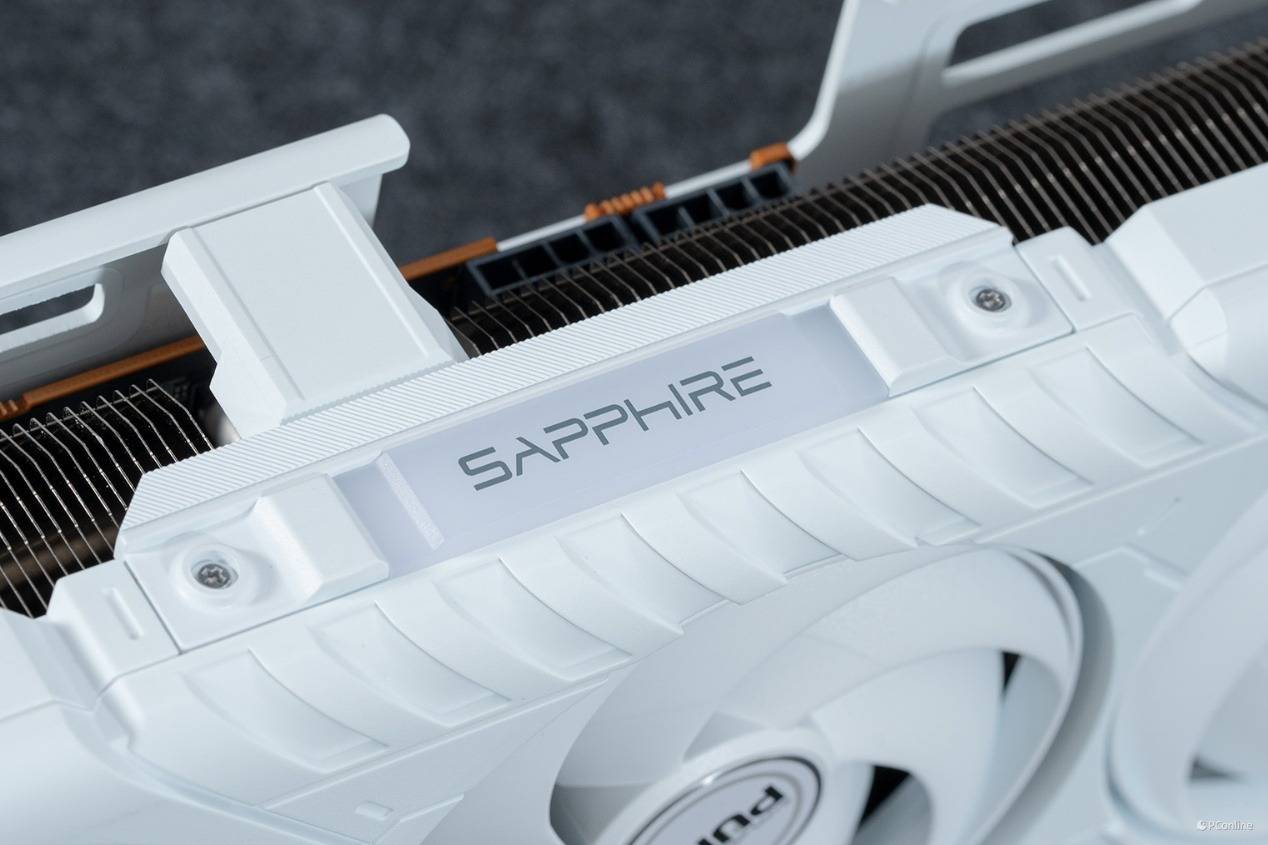 显卡的背部则采用全尺寸的金属背板,并且延续了正面的配色,将白色进行到底。不过蓝宝石还在金属背板上加入了线条装饰,让整张显卡更具动感。