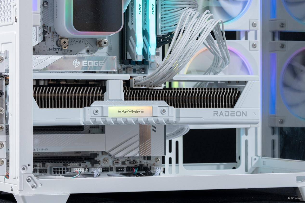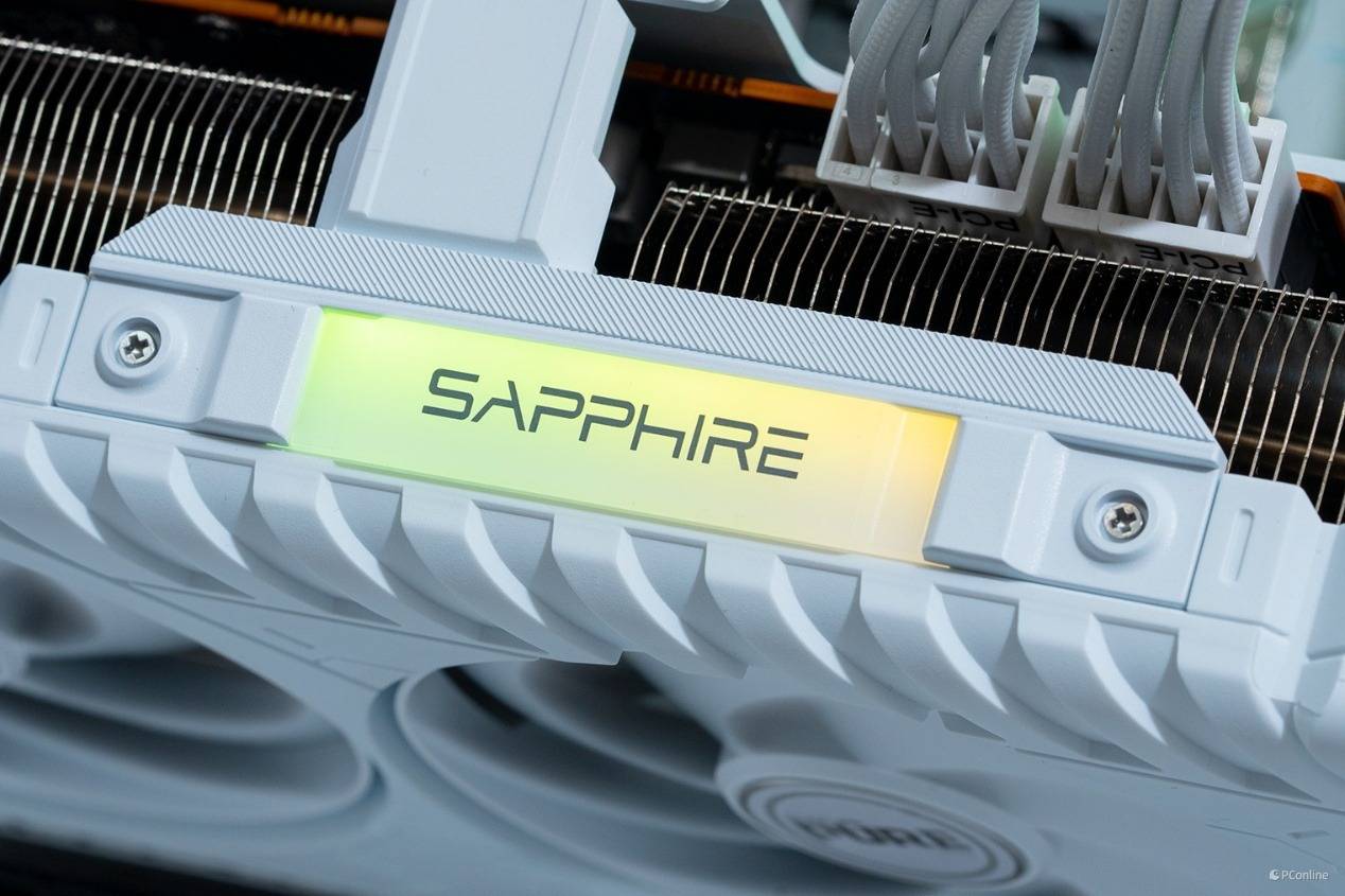 下面是显卡的上机展示,首先最醒目的就是刚刚提到的“SAPPHIRE”灯牌,通电上机后,五彩斑斓的RGB灯效瞬间给这款纯白的显卡增添了不一样的色彩。