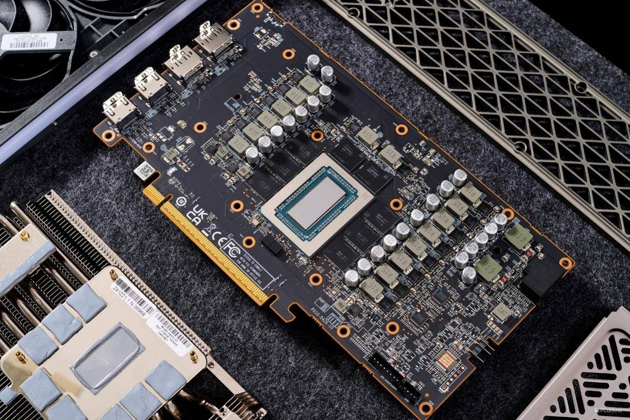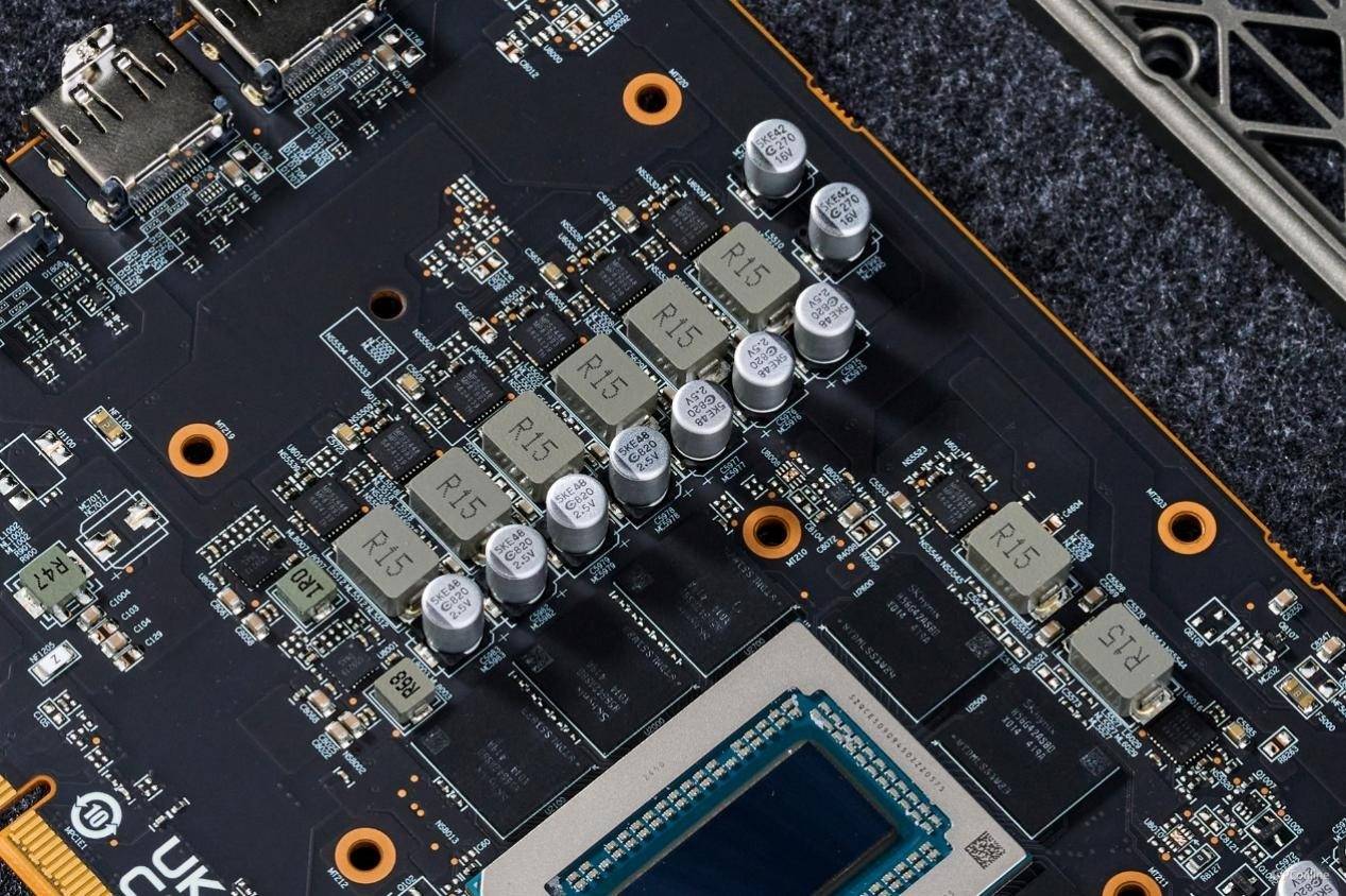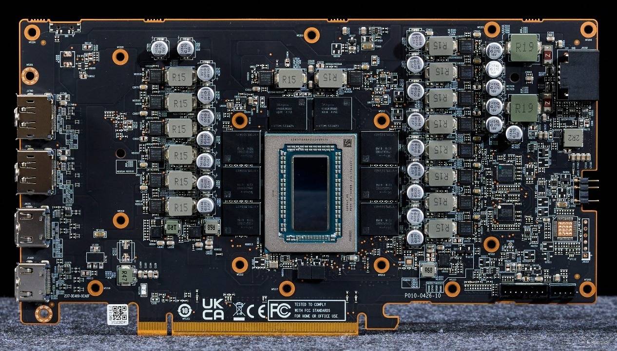 回到正面,整张PCB上最重要的就是中央的Navi 48核心了,与上代RX 7000系显卡用到的核心不同,此前的Navi 31采用的是小芯片设计结合MCM封装,GCD和MCD分别采用了5nm和6nm工艺。而此次Navi 48芯片再度回归单芯片设计,并且升级为TSMC N4P工艺,在357mm²内塞入了539亿晶体管,晶体管密度达到了150 MTr/mm²。这么说你可能没有概念,RTX 50系上的GB203芯片,面积为378 mm²,晶体管为456亿,密度为120.6 MTr/mm²,AMD比起这一代英伟达Blackwell架构GPU高出了大概25%,考虑到二者的制程工艺基本一致,这个差距还是非常惊人的。