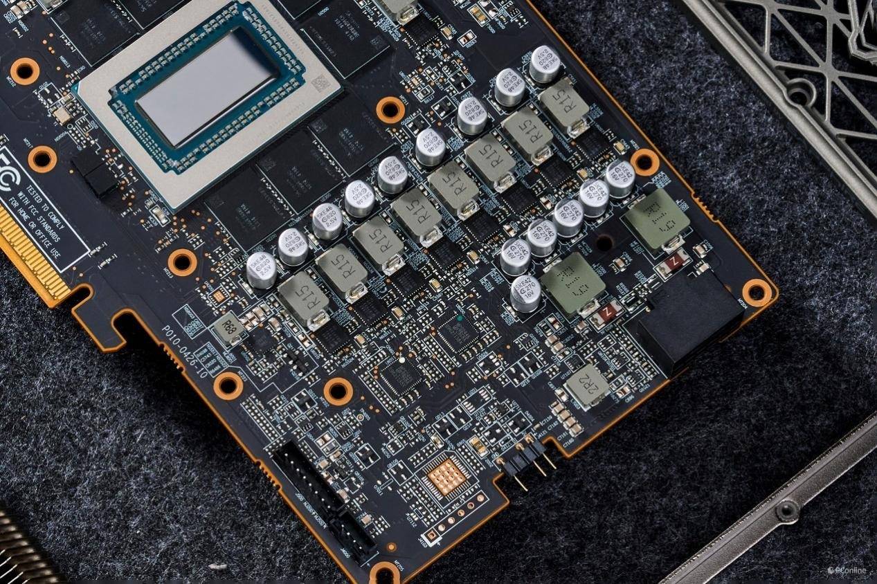 首先看看PCB设计,采用12层多倍铜打造,越肩设计,比一般显卡都要高一些。不过PCB上的接口、供电、核心、显存,以及辅助供电位置都相当的合理且规正,有大厂出品的质感。