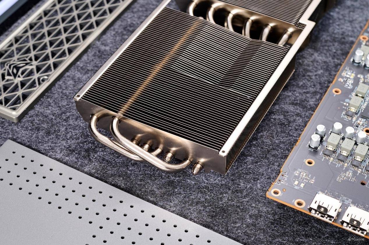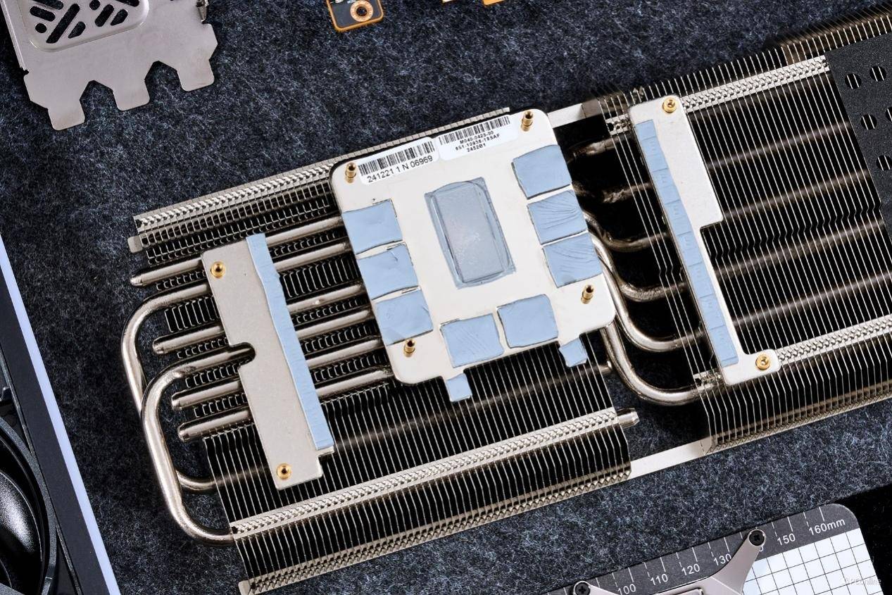 率先映入眼帘的是中央巨大的一体式散热模组,这种设计确保散热模组与GPU、显存和MOS管直接接触,实现了均匀的热调节。有助于保持稳定的工作温度,提高系统性能和稳定性。
