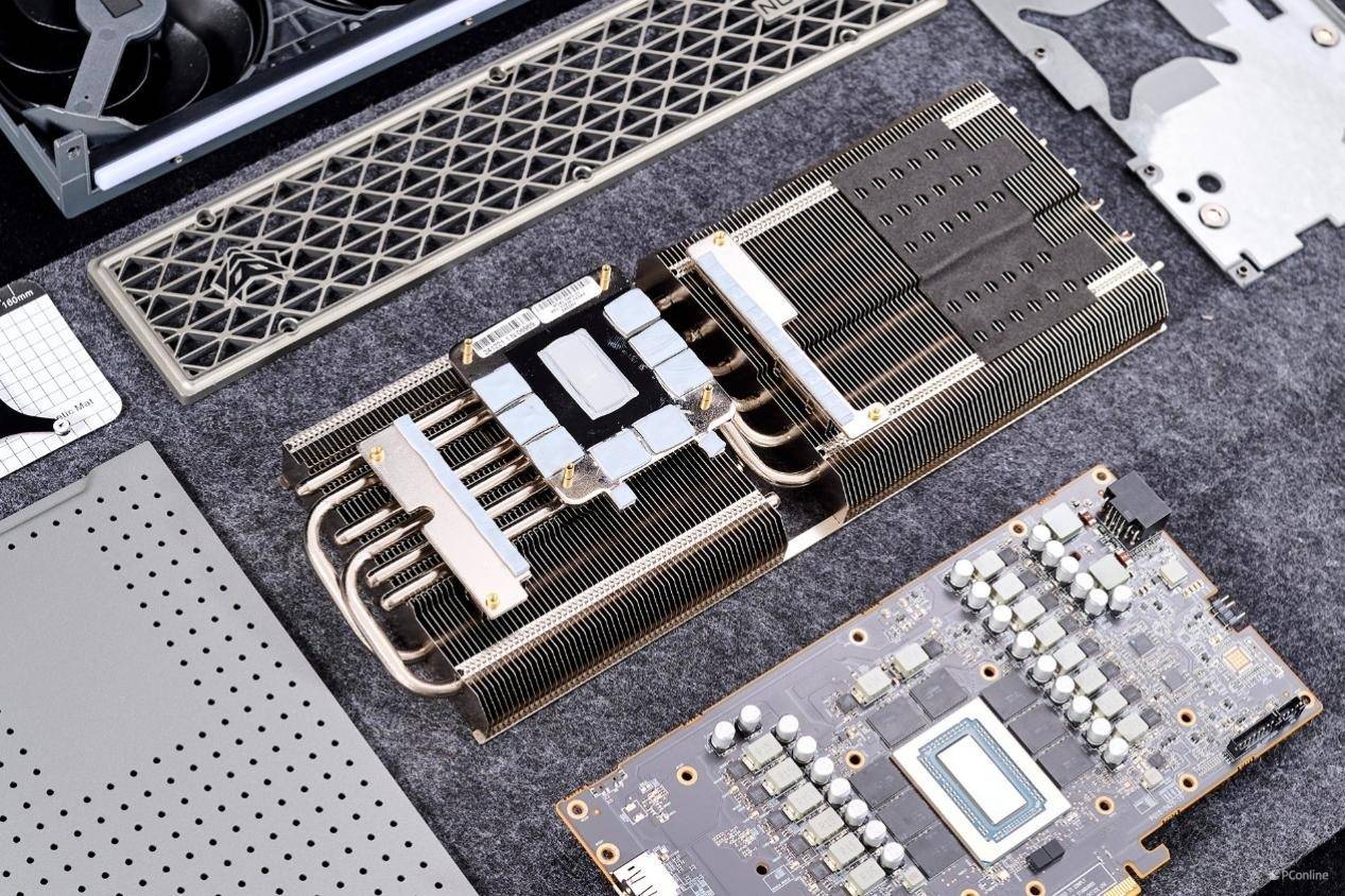 接下来我们看这款显卡的散热系统,有一说一,这款显卡足足有3.2槽厚,这也让我非常好奇它内部的散热究竟有多豪华。