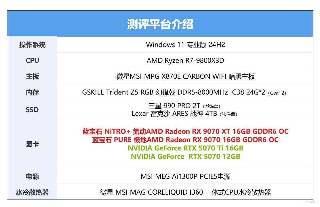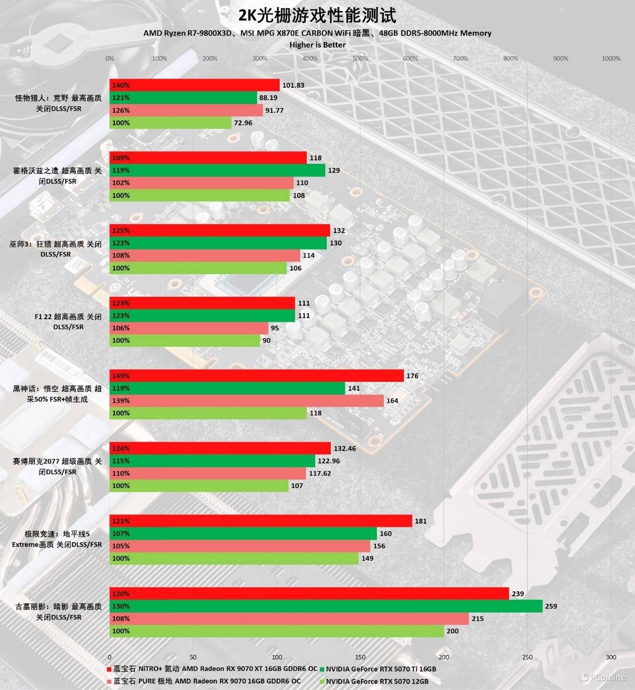 下面是各位玩家心心念念的游戏性能测试,首先是光栅游戏部分,此次参与测试的游戏共8款,测试时能够关闭超分技术的游戏我们都进行关闭,采用最高画质进行测试。实测2K分辨率下,蓝宝石NiTRO+氮动AMD RADEON RX 9070 XT平均领先RTX 5070 Ti约6%左右,蓝宝石PURE极地AMD RADEON RX 9070对比RTX 5070则领先约13%。