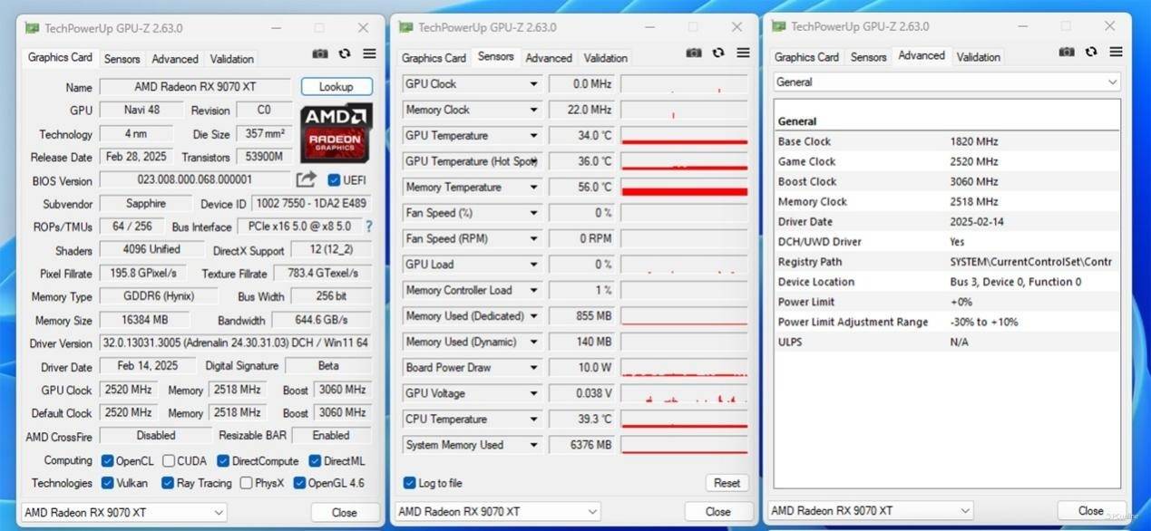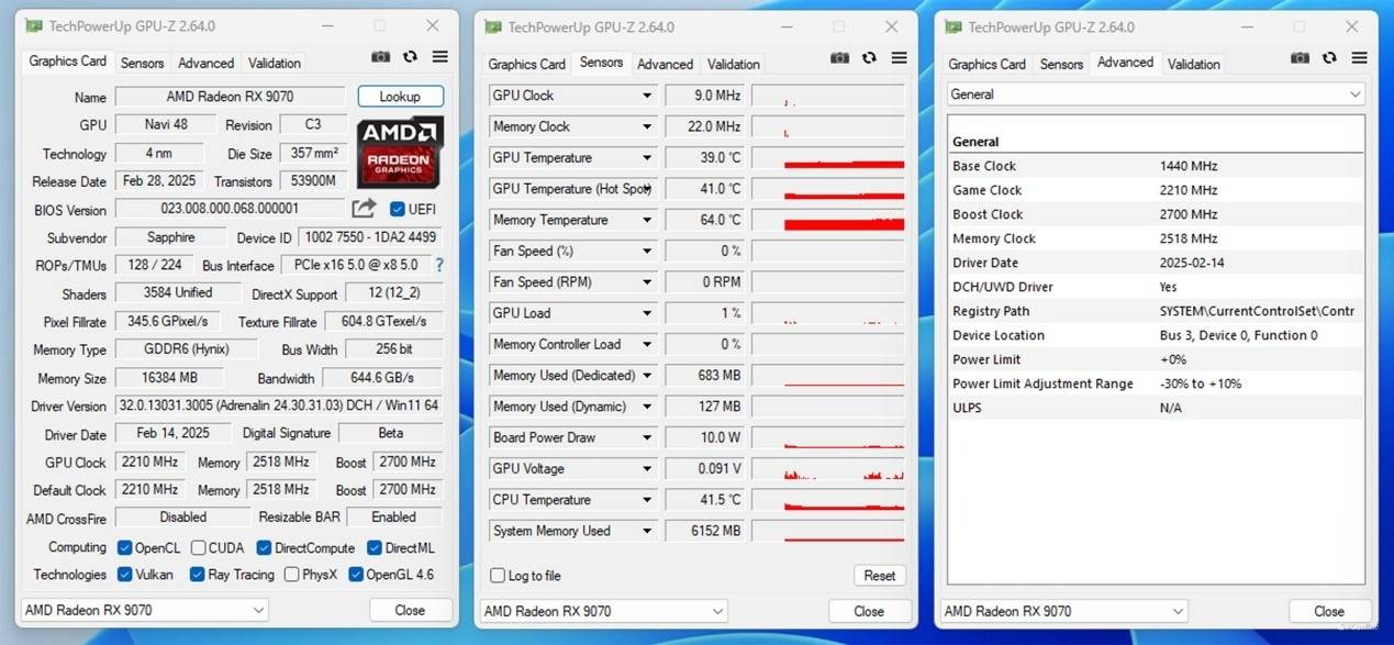 在硬件规格上,RADEON RX 9070 系列显卡中较高端的 RX 9070 XT 将搭载 64 个 CU,流处理器高达4096个,加速频率也非常恐怖,可达 2970MHz,TBP功耗为 304W;而我们上手的蓝宝石NiTRO+氮动AMD RADEON RX 9070 XT为OC版本,因此其加速频率直接来到了3060MHz!同时TBP设定也高于304W,达到了330W,为超频预留了空间。