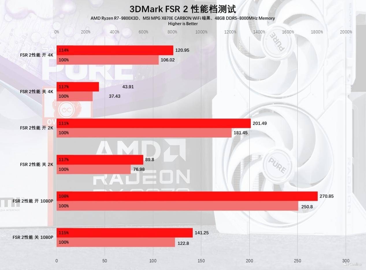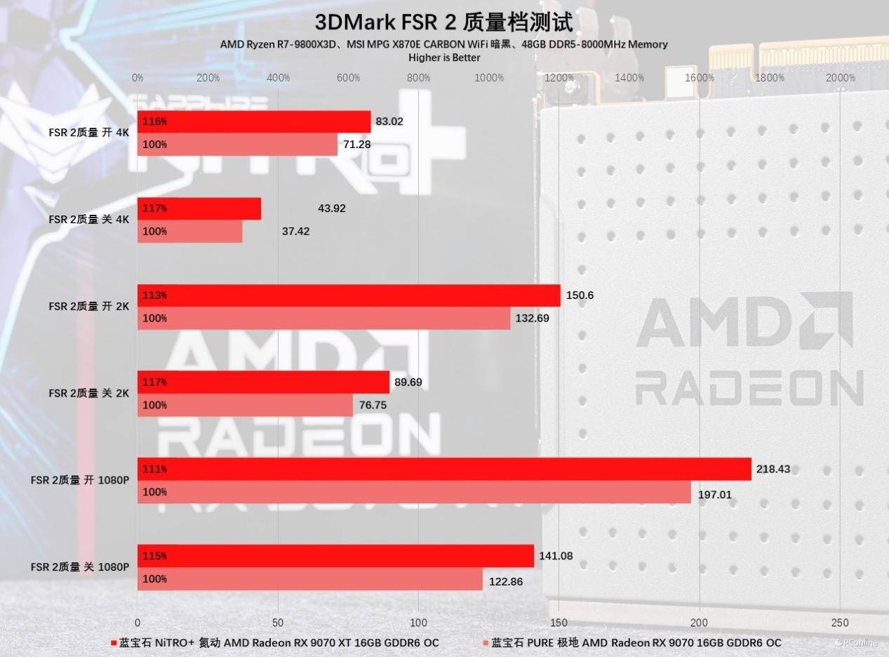 光追层面,在Port Royal测试中,蓝宝石PURE极地AMD RADEON RX 9070对比RTX 5070强11%,而RX 9070 XT则稍稍弱RTX 5070 Ti 5%,考虑到二者的硬件规格差距,这个表现还是可以接受的。另外说到光追,就不能不提FSR,这里选用3DMark中的FSR 2测试,从结果上看,在质量档的设定下,两款显卡都复合4K游戏的定位,仅开启FSR 2的情况下,4K就分别有71 FPS以及83 FPS的表现。
