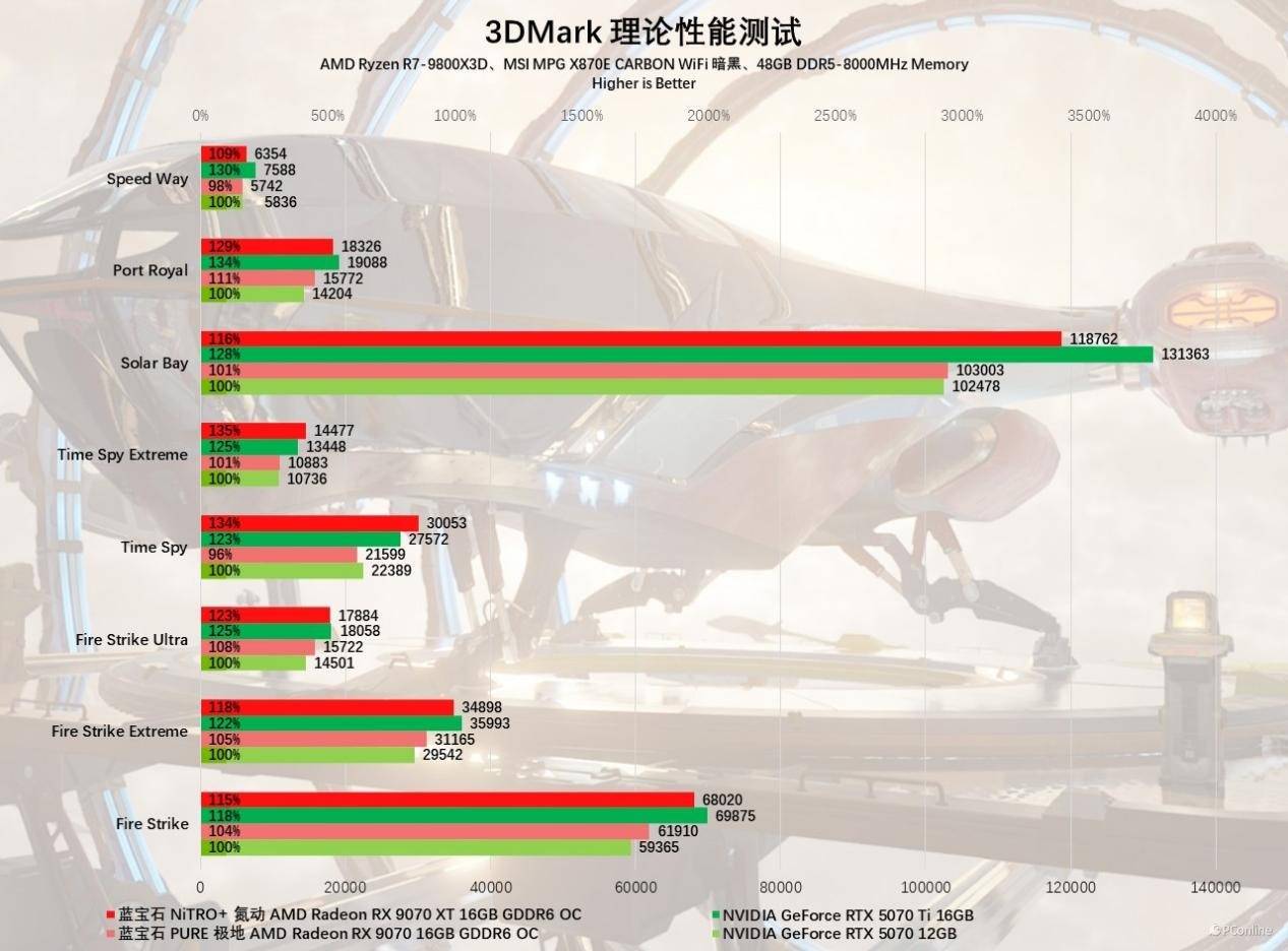 理论性能部分,一如既往的,我们仍是采用3DMark来进行基准性能测试。在Fire Strike系列测试中,两款显卡表现亮眼,4K分辨率下,蓝宝石NiTRO+氮动AMD RADEON RX 9070 XT与RTX 5070 Ti不分伯仲,二者性能仅差2%,甚至可以说是测试误差了;蓝宝石PURE极地AMD RADEON RX 9070则凭借更大的显存,领先RTX 5070约8%。而在以DX12为代表的Time Spy测试中,同样是4K分辨率,蓝宝石NiTRO+氮动AMD RADEON RX 9070 XT对比RTX 5070 Ti实现了反超,强约10%,而RX 9070也几乎与RTX 5070打成平手。