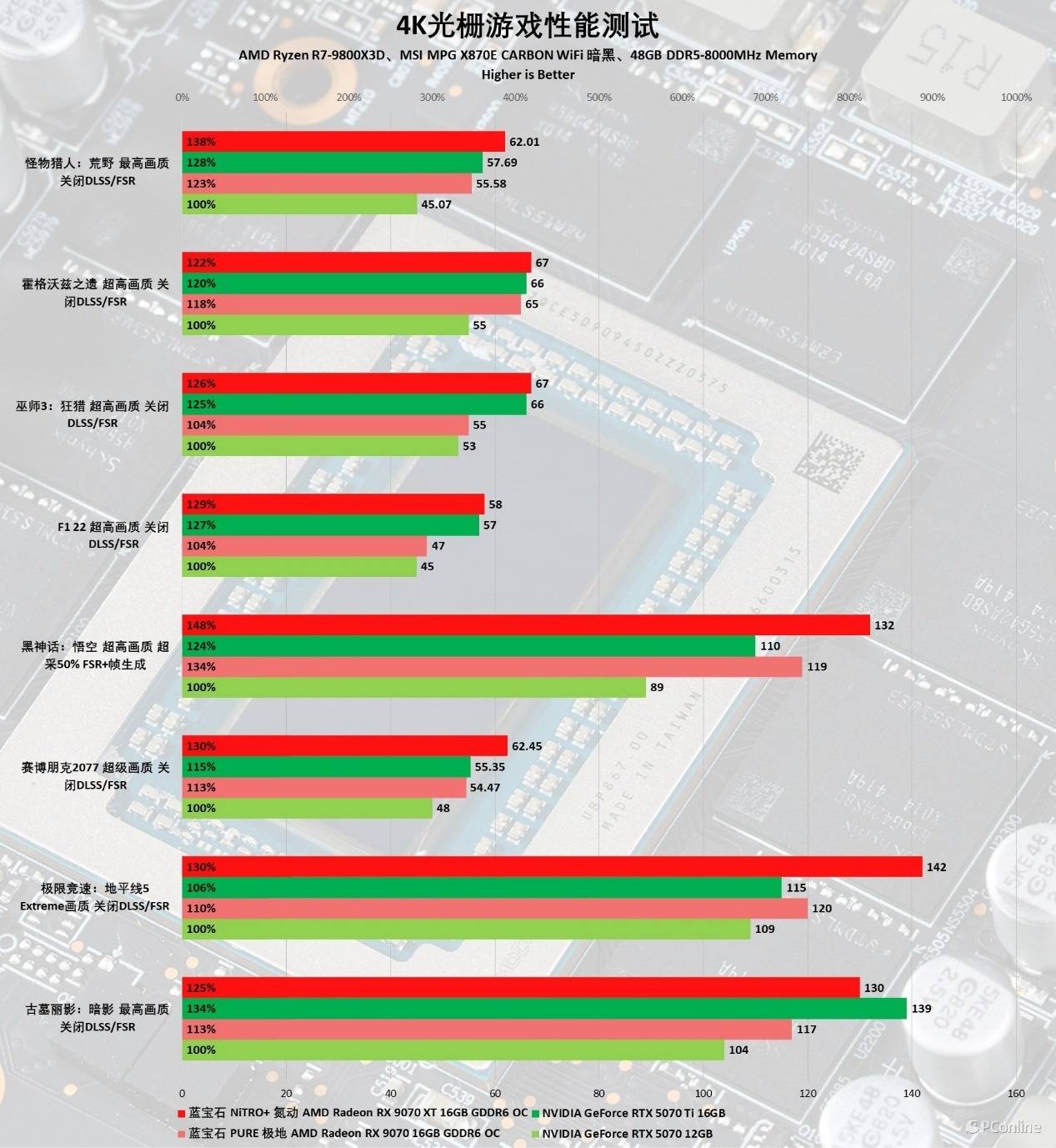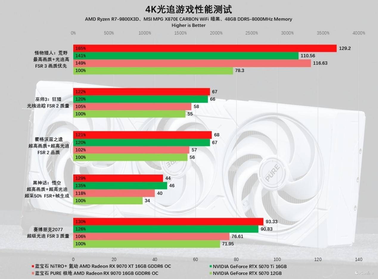4K光追条件下,表现与2K时基本一致。蓝宝石NiTRO+氮动AMD RADEON RX 9070 XT在参测的五款游戏中,有4款都能领先RTX 5070 Ti,在有显卡杀手之称的《赛博朋克2077》中,也能比RTX 5070 Ti高约6%,而蓝宝石PURE极地AMD RADEON RX 9070因为更大的显存凭借大显存,也可以领先RTX 5070约6%。《怪物猎人:荒野》的情况也类似,RX 9070 TX与RX 9070分别领先RTX 5070 Ti和RTX 5070约24%以及49%。