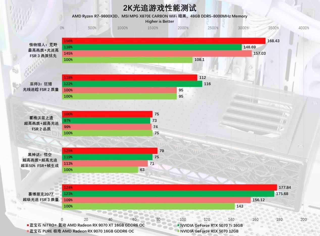 光追游戏部分,蓝宝石NiTRO+氮动AMD RADEON RX 9070 XT则与RTX 5070 Ti打得有来有回,大部分游戏中两款显卡的游戏性能几乎一致。不过在最新推出的《怪物猎人:荒野》中,蓝宝石NiTRO+氮动AMD RADEON RX 9070 XT的表现更佳,实测2K最高光追条件下,同样开启FSR 3超分技术,RX 9070 XT可以领先RTX 5070 Ti约18%。而蓝宝石PURE极地AMD RADEON RX 9070则更夸张,直接领先RTX 5070约45%。