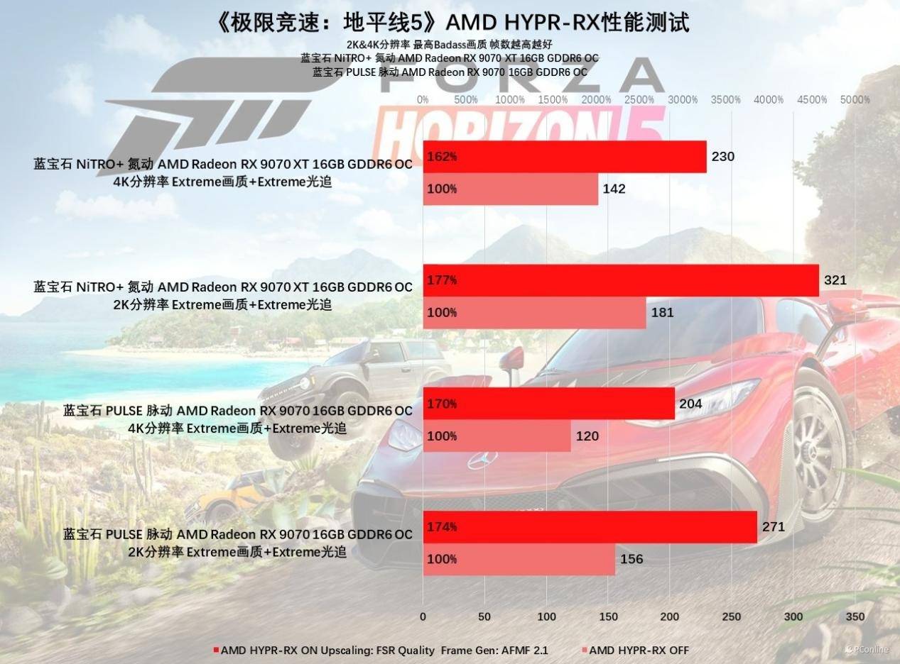 在另一款游戏《极限竞速:地平线5》中,搭载AFMF 2.1的HYPR-RX同样给游戏带来了新的体验。在原生4K分辨率下,蓝宝石NiTRO+氮动AMD RADEON RX 9070 XT的平均帧为142 FPS,蓝宝石PURE极地AMD RADEON RX 9070则是120 FPS,都能满足高刷体验,不过开了HYPR-RX后,游戏帧数就像打了鸡血一样,直接上升至200+ FPS,这已经不能用流畅来形容了,应该叫丝滑。