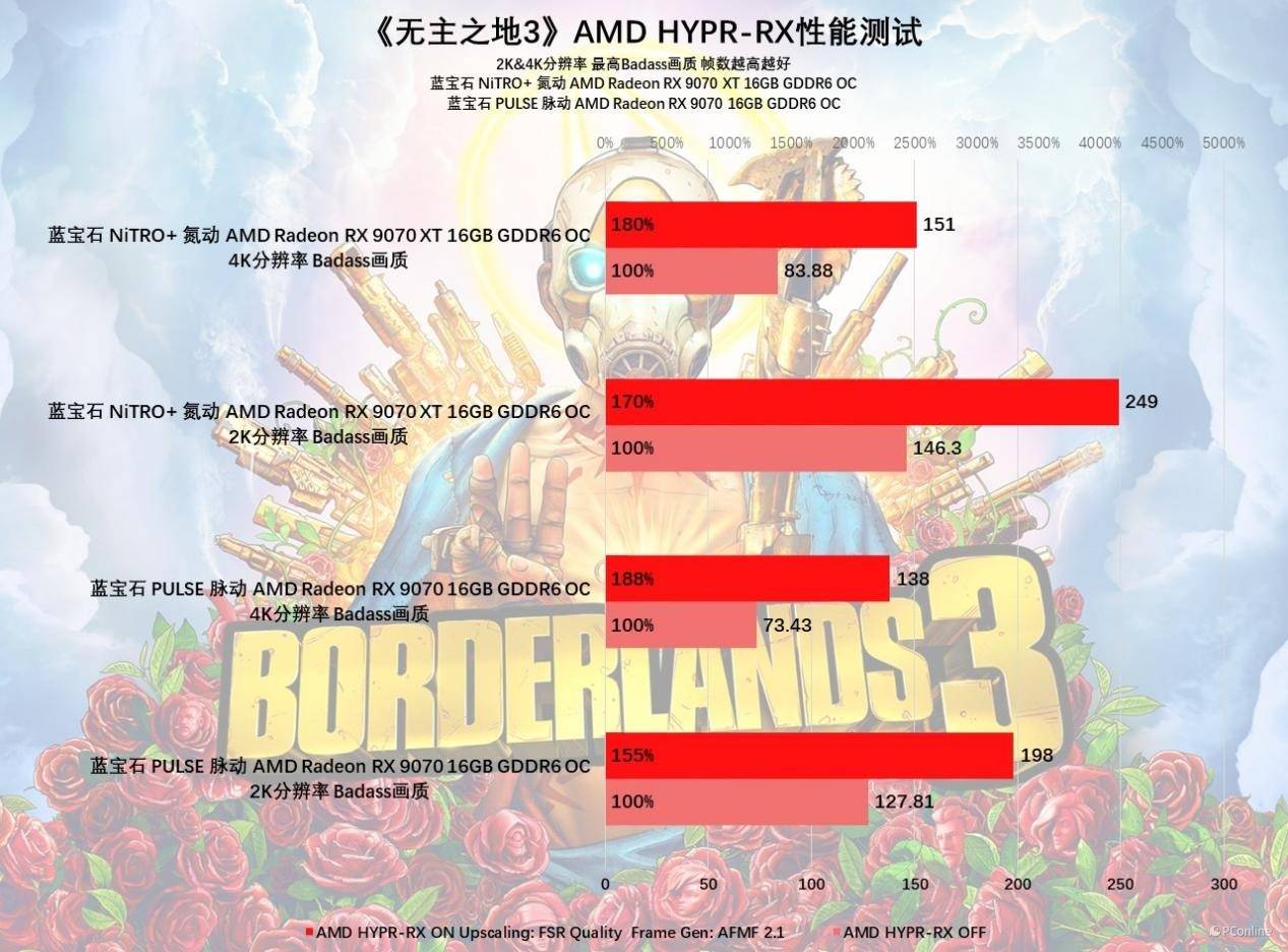 实测《无主之地3》中开启AMD HYPR-RX功能确实有用,特别是在开启AFMF 2.1功能后,游戏帧数有了明显的提升。例如蓝宝石NiTRO+氮动AMD RADEON RX 9070 XT在4K分辨率下,开关HYPR-RX功能,帧数差距足足有80%之多,这已经是显卡跨代的性能提升了,而蓝宝石PURE极地AMD RADEON RX 9070也不错,4K分辨率下,原生只有73 FPS,基本满足流畅运行,而开启HYPR-RX后,帧数已经直逼144 FPS,非常夸张。