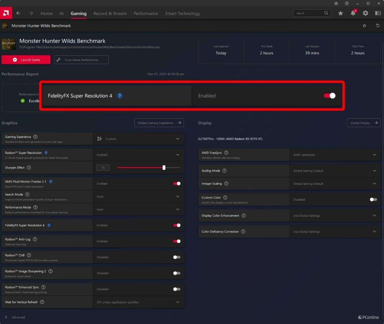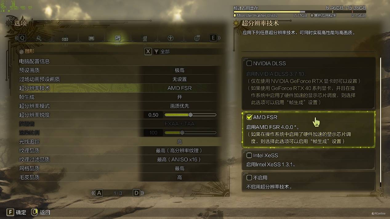 当然,应该也有不少玩家关心FSR 4的表现,这里我们也是挑选了首发支持FSR 4的《怪物猎人:荒野》进行测试。开始游戏之前,记得在AMD的驱动中开启FSR 4选项,如果你想玩的游戏已经支持FSR 3.1,开启该选项后,游戏内即可支持最新的FSR 4。