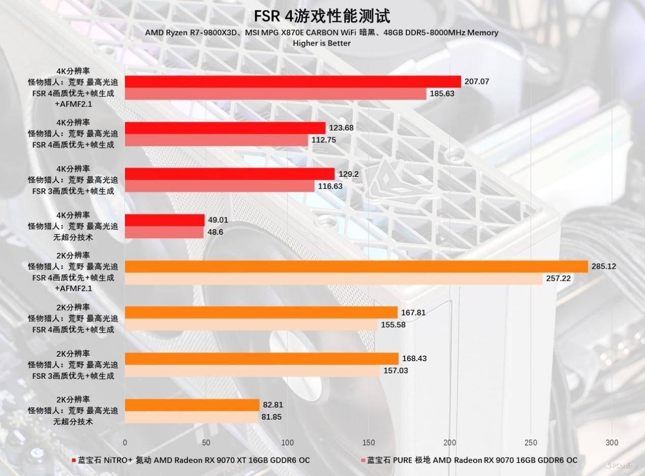 实测2K分辨率最高光追的情况下,不开启任何超分技术,蓝宝石NiTRO+氮动AMD RADEON RX 9070 XT的平均帧为83 FPS,蓝宝石PURE极地AMD RADEON RX 9070则是82 FPS,4K则分别为49 FPS以及48 FPS。开启FSR 4以后,游戏帧数能够明显提升,两款显卡均能实现2K以及4K高刷畅玩的水准。如果你追求更高的帧数,那还可以用FSR 4搭配AFMF 2.1技术,从而实现超高帧率水准。