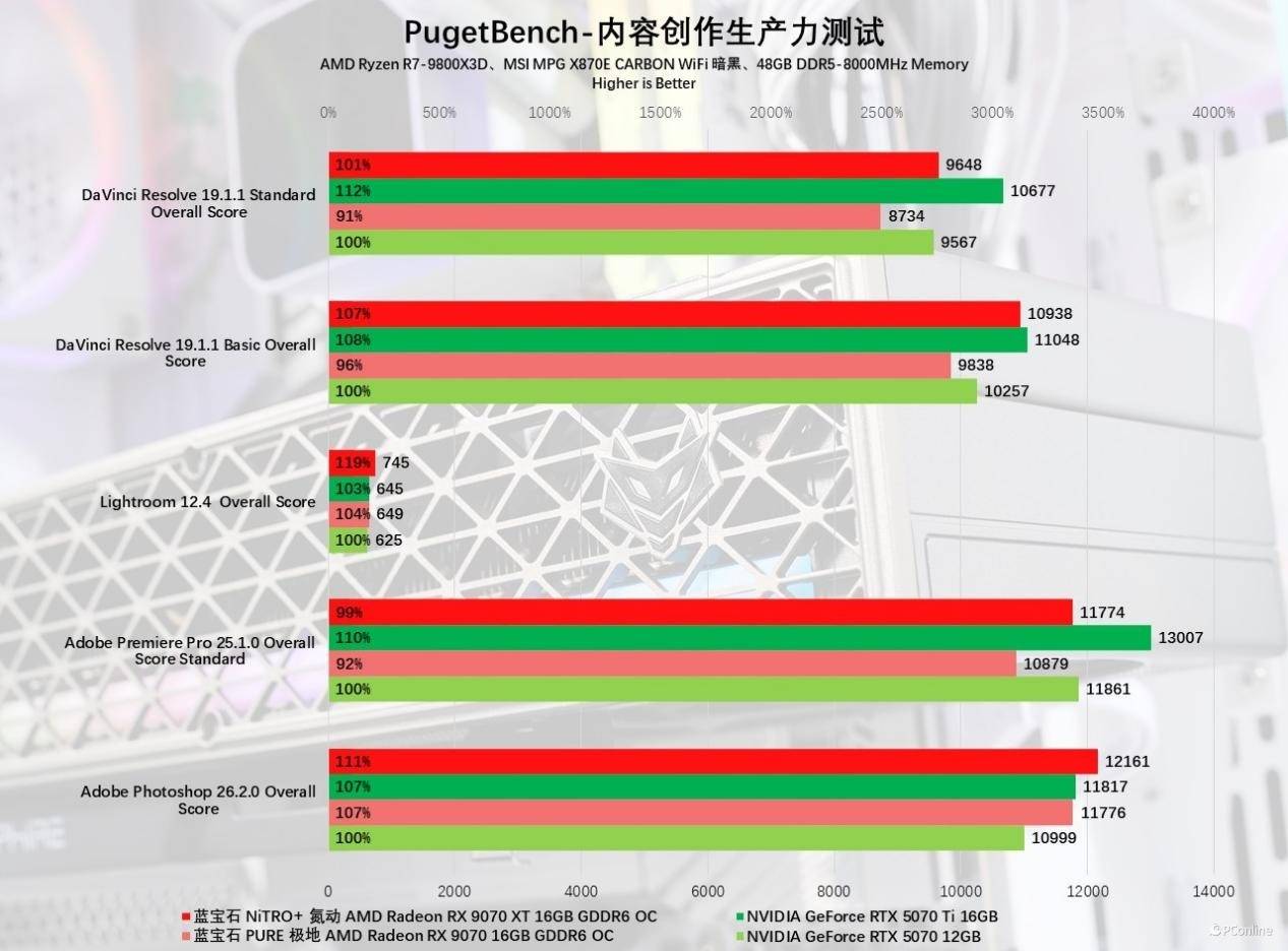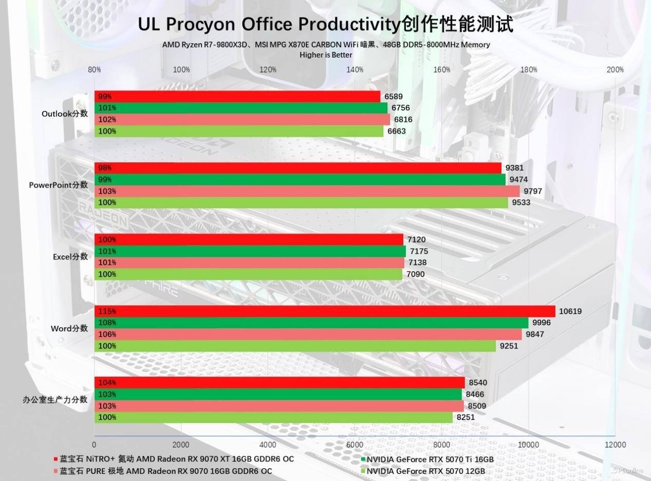 游戏之后,则是创作相关的测试。在UL Procyon的办公软件测试中,无论是蓝宝石NiTRO+氮动AMD RADEON RX 9070 XT,还是蓝宝石PURE极地AMD RADEON RX 9070都表现优异。虽然办公对这个级别的四款显卡没什么难度,不过两款AMD新显卡依旧领先各自的竞品约1-3%。