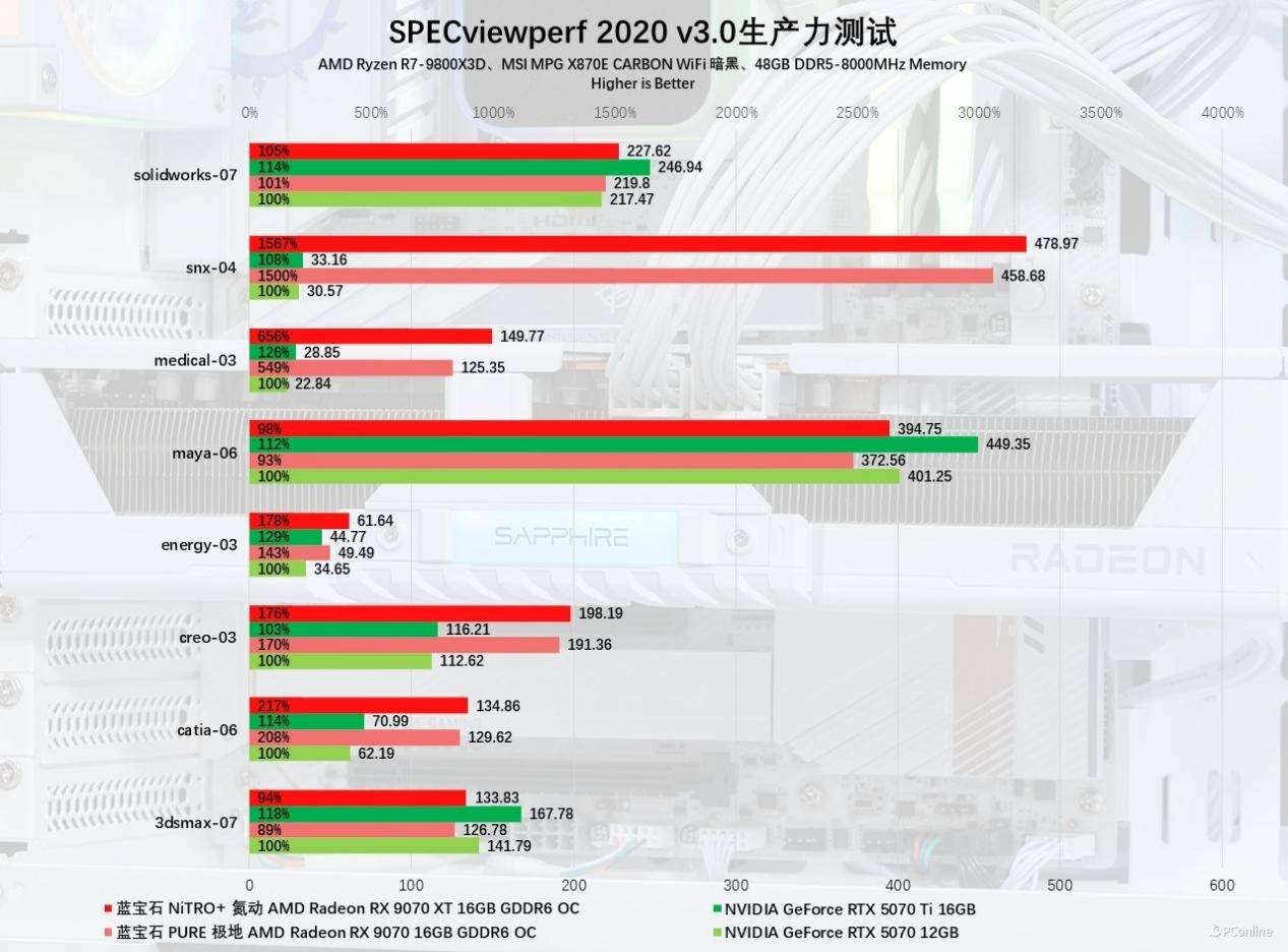 下面出场的工业软件则是AMD的拿手好戏,我们测试了SPECviewperf2020,不测不知道,一测发现AMD显卡的表现简直逆天。例如在energy-03、creo-03、catia-06等不少项目中,蓝宝石NiTRO+氮动AMD RADEON RX 9070 XT能够领先RTX 5070 Ti约1-2倍!蓝宝石PURE极地AMD RADEON RX 9070面对RTX 5070也几乎是一样的涨幅。更夸张的是,如果你需要用到西门子相关的snx-04项目,那两张A卡的性能绝对能吓你一跳,它们几乎是竞品的15倍之多!