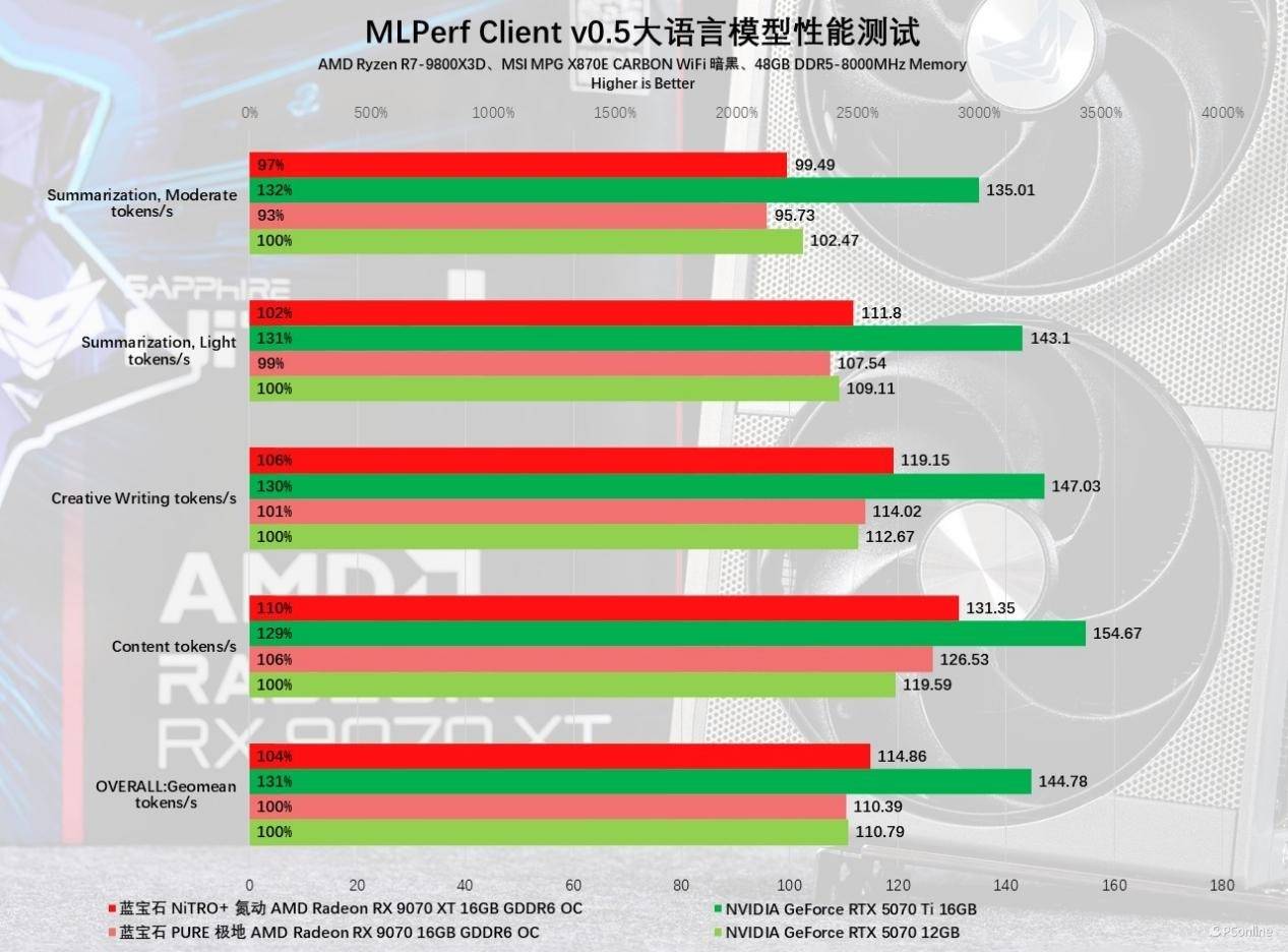 实测蓝宝石PURE极地AMD RADEON RX 9070在这一项中表现出色,基本上与隔壁的RTX 5070不相上下,究其原因还是因为其搭载了16GB 256-bit的GDDR6显存,更大的显存能够运行更大参数量的大语言模型。而蓝宝石NiTRO+氮动AMD RADEON RX 9070 XT则比rx 9070更进一步,性能强约5%左右,不过与RTX 5070 Ti还有一定差距,不过,玩家作为入门使用的话,那这款显卡确实值得考虑,加上还有16G的大显存,这在AI领域已经有不小的优势了。就等AMD来一个“鸡血”,届时AI性能就又能有史诗级提升了。