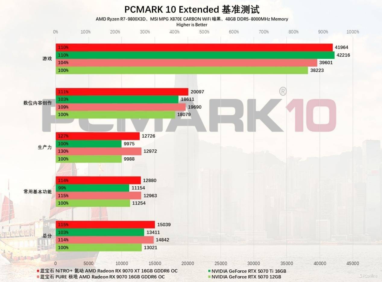 实测在PCMark10 Extended中,无论是蓝宝石NiTRO+氮动AMD RADEON RX 9070 XT,还是蓝宝石PURE极地AMD RADEON RX 9070,它们的表现都比隔壁的RTX 5070以及RTX 5070 Ti要优秀,特别是在基本功能、数位内容创作以及生产力方面。其中蓝宝石PURE极地AMD RADEON RX 9070基本上要比RTX 5070强14%左右,而蓝宝石NiTRO+氮动AMD RADEON RX 9070 XT就更加逆天了,对比RTX 5070 Ti的话,性能领先也有12%,基本与上面的测试结果相符。