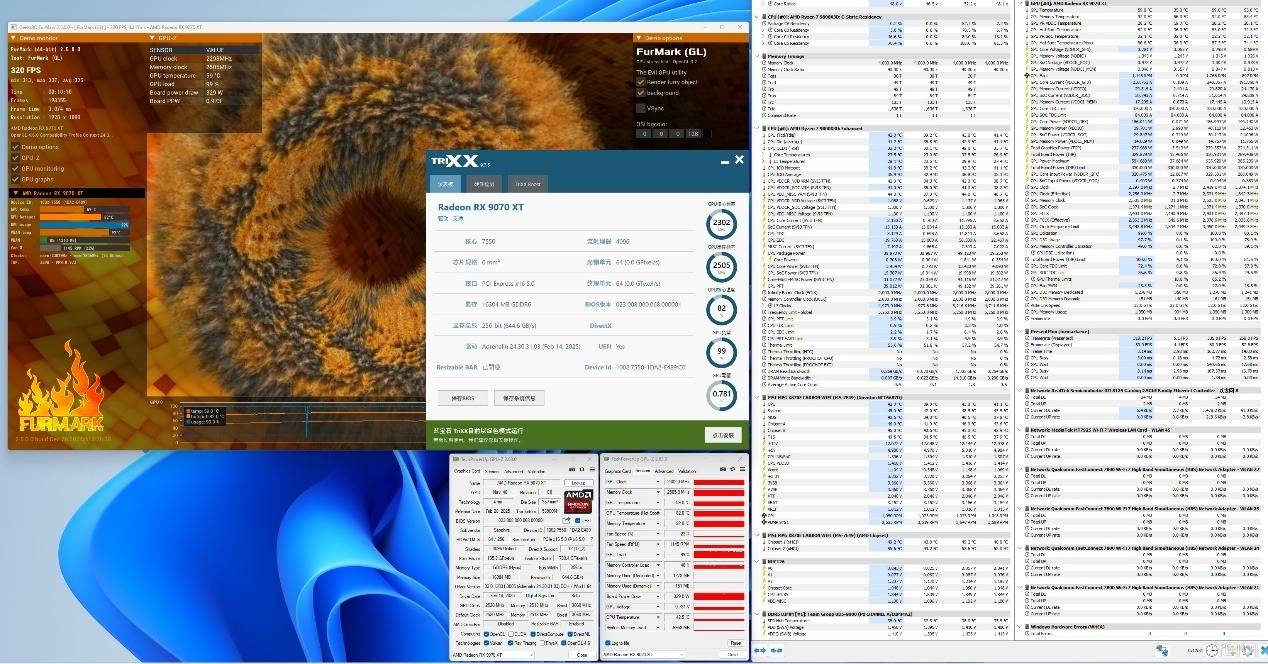最后是功耗与温度测试,在室温21°的环境下,Furmark2甜甜圈设定为1920×1080分辨率。在烤机10分钟后,蓝宝石NiTRO+氮动AMD RADEON RX 9070 XT的核心频率能够稳定在2302MHz,显存则为2505MHz,满载功耗也仅有329W。不过这是高负载的情况,日常使用基本不会达到这个程度。