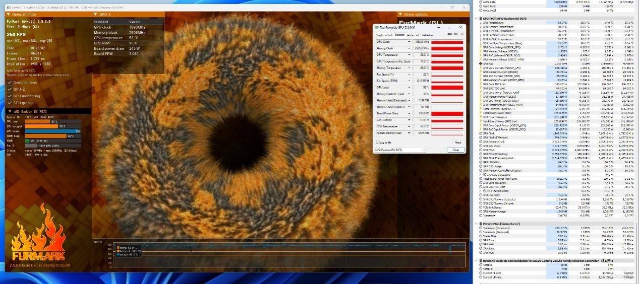 再看蓝宝石PURE极地AMD RADEON RX 9070的表现,同样是1080P烤机测试,实测满载核心频率为1893MHz,显存为2505MHz。此时显卡功耗也是顶着245W的TDP上限在运行。
