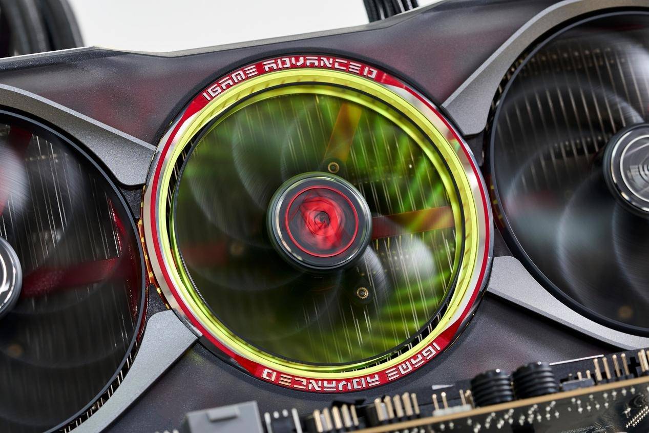 在外观设计上,iGame RTX 5070 Advanced OC 12GB延续了iGame系列的高端风格,采用磨砂黑透外壳和标志性的“引力之环”RGB灯环,视觉效果引人注目。其散热系统采用三把大口径风镰扇叶、7根镀镍热管和大面积散热片,确保了高效散热和低噪音运行。