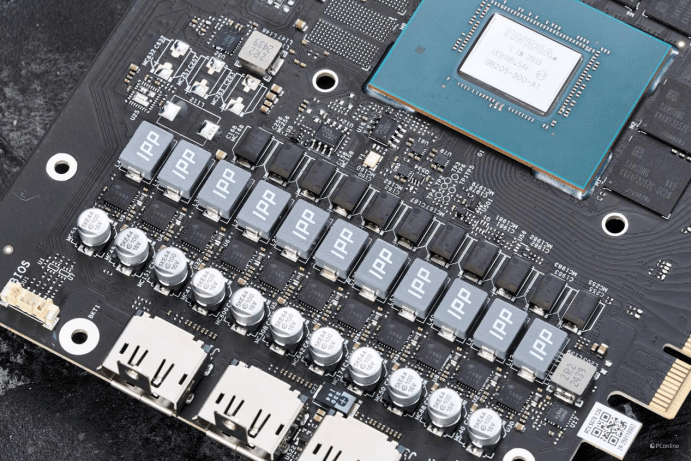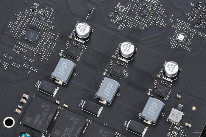 PCB两侧分别是显卡的11+3相供电,供电相数与用料均比RTX 5070 FE公版供电设计更为豪华。而且前后端均采用了大量的贴片固态电容+聚合物电容,为GPU与显存提供更为纯净的供电。