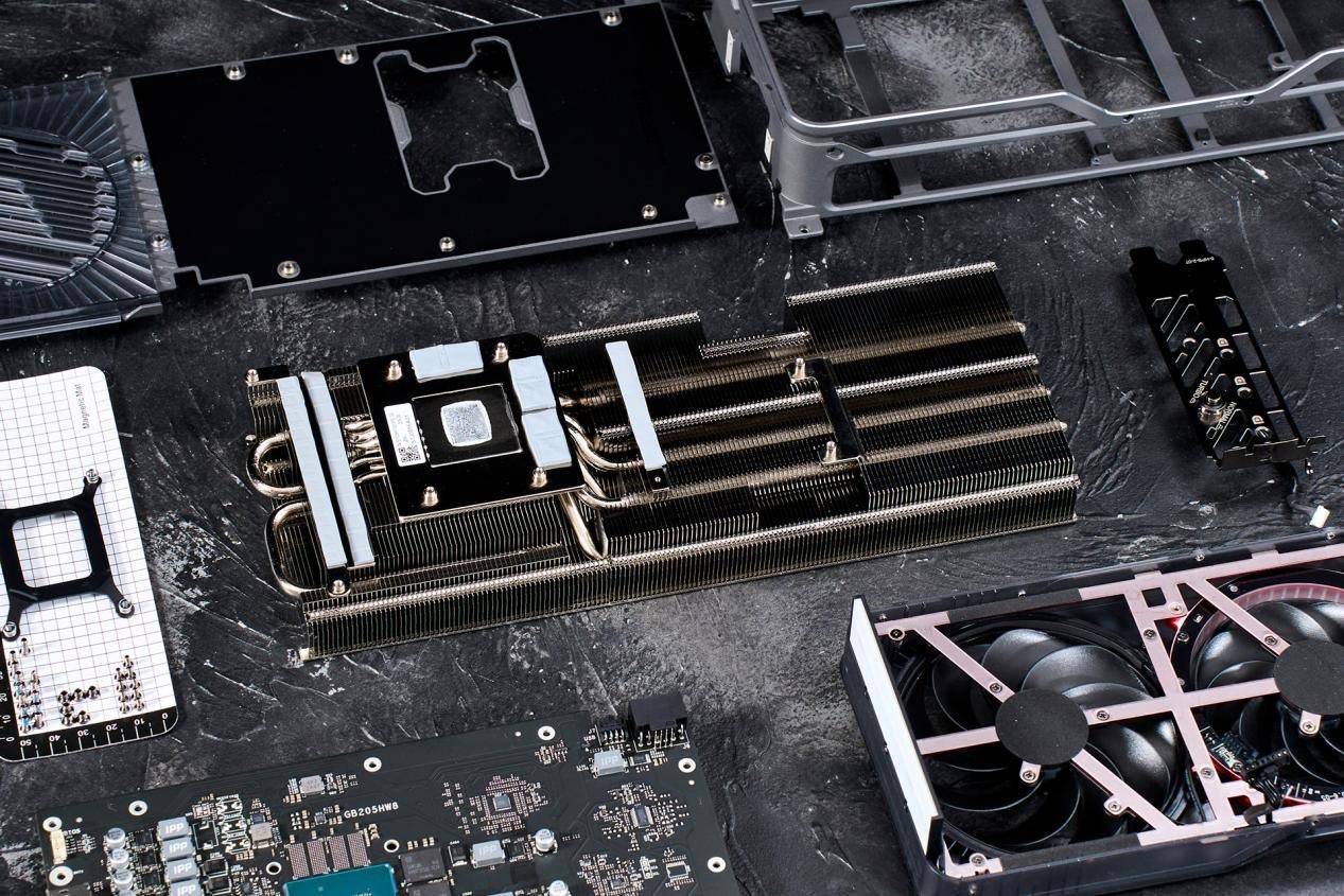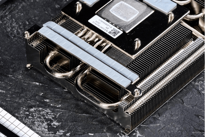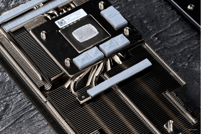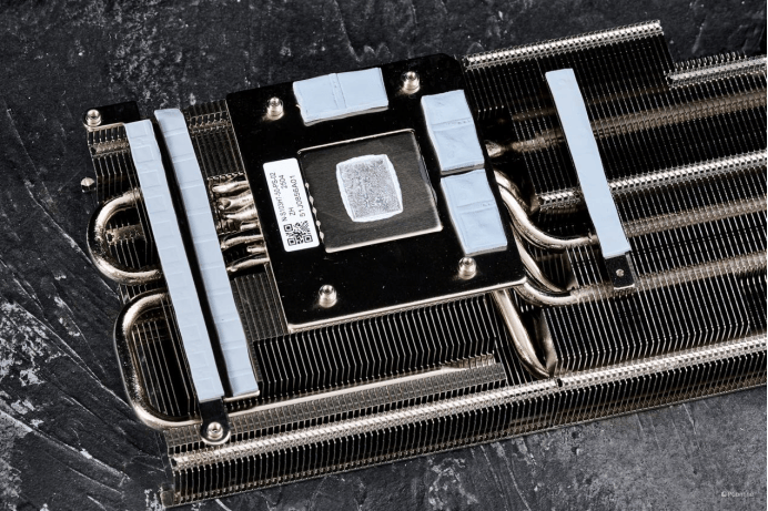 散热器与GPU的接触面采用了纯铜底座,与7根热管一样,均经过了镀镍工艺处理,这不仅能够防止氧化,还能确保更持久的散热性能;显存和供电模块均配备了导热垫,而导热金属板则与散热器焊接为一体,从而进一步增强了散热效果。