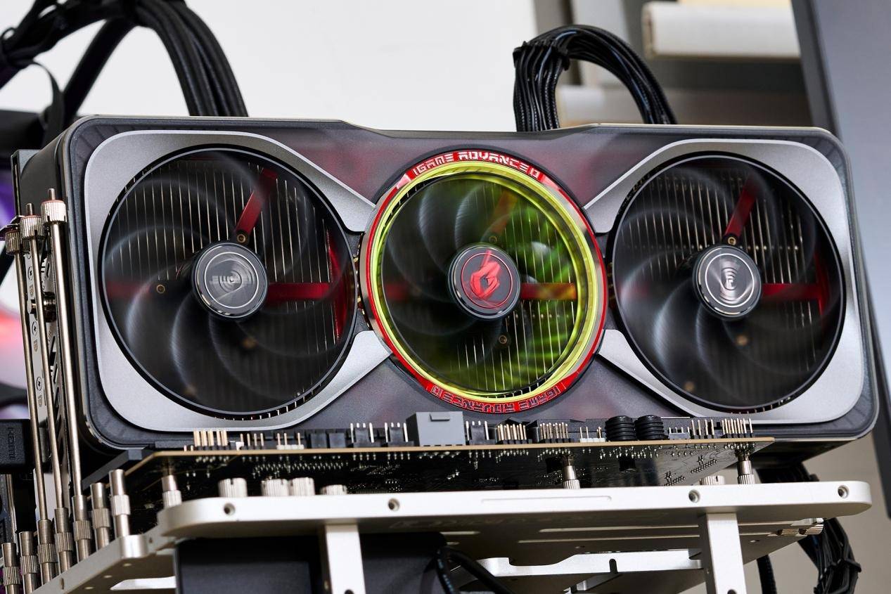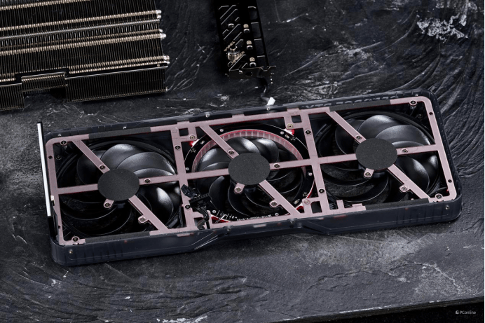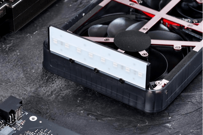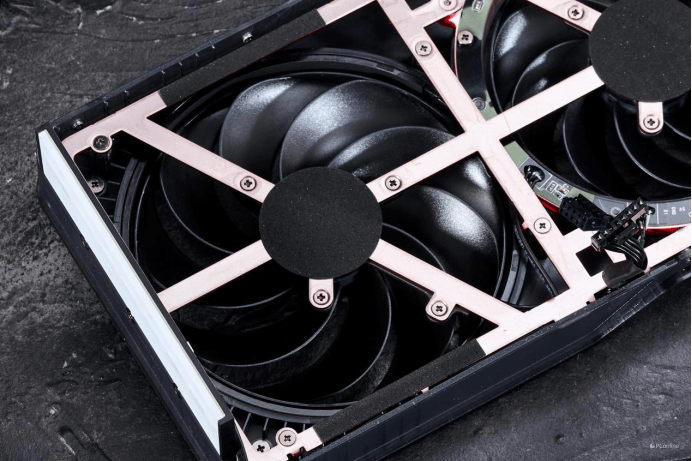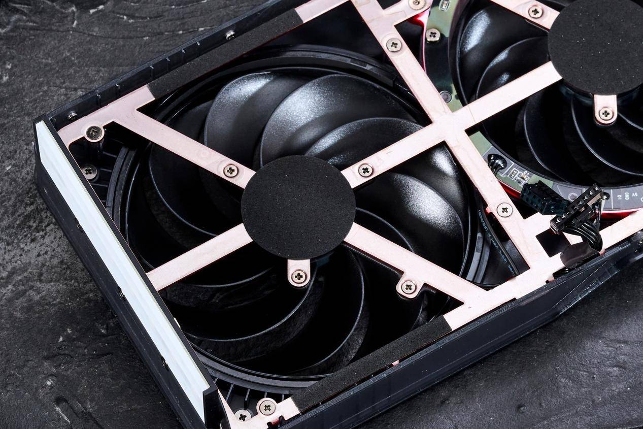 中间的小风扇采用了与两侧风扇扇叶相反的设计,这可以进一步减少风扇间的扰流影响,有效降低风扇噪音。