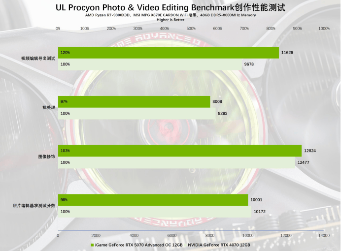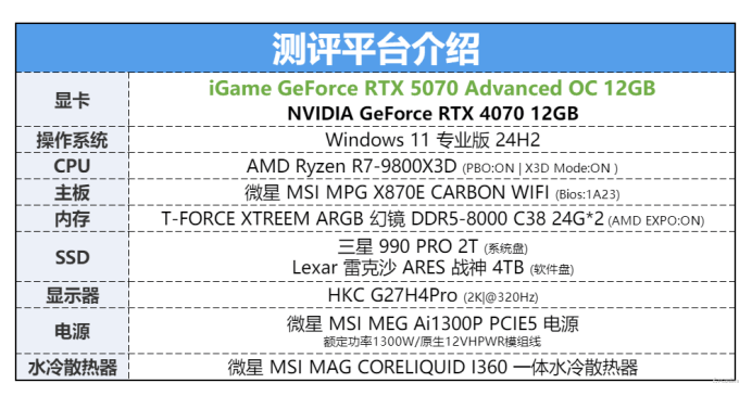 至于对标显卡方面,我们这次拿NVIDIA上代RTX 4070显卡与iGame RTX 5070 Advanced OC 12GB进行性能对比,分别对理论性能、游戏性能、DLSS性能、创作能力、AI性能,以及功耗等不同维度的表现。
