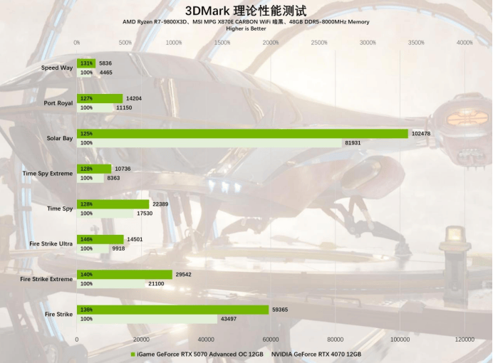 先进行的是3DMARK理论性能测试:在传统的FireStrike系列测试中,iGame RTX 5070 Advanced OC 12GB性能提升幅度很大,平均领先上代RTX 4070能达到40.8%;其中DX12的Time Spy系列测试中,iGame RTX 5070 Advanced OC 12GB同样有着28%的领先幅度。