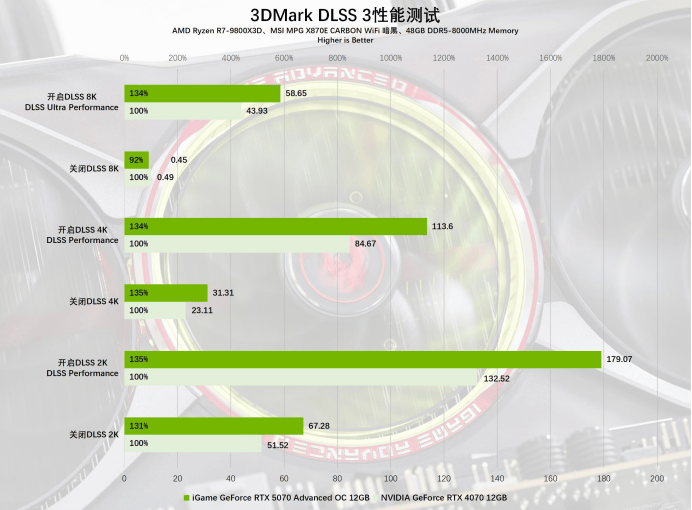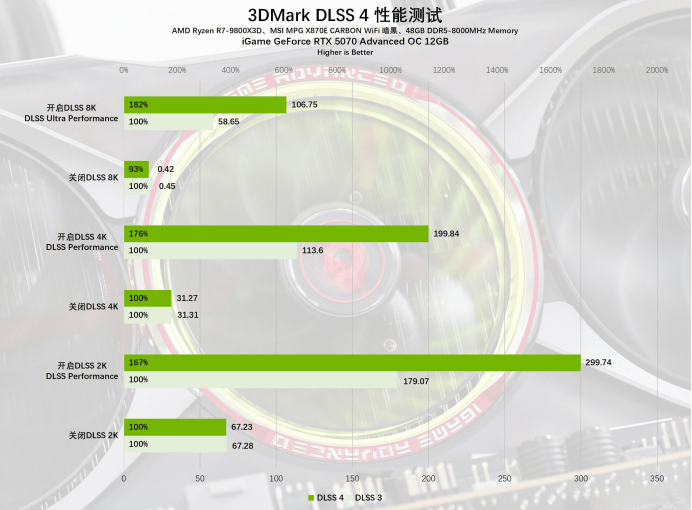 将DLSS3的测试结果与之对比,我们发现,在iGame RTX 5070 Advanced OC 12GB显卡上启用DLSS4技术后,帧数的提升尤为显著。在2K分辨率下,DLSS 4技术的启用使得性能差异达到了惊人的4倍。而在4K分辨率下,性能的提升更是令人难以置信,达到了6倍之多。最令人印象深刻的是,在8K分辨率下,iGame RTX 5070 Advanced OC 12GB显卡借助DLSS 4技术,能够使测试DEMO稳定运行在107 FPS,这是一个极为流畅的帧率。