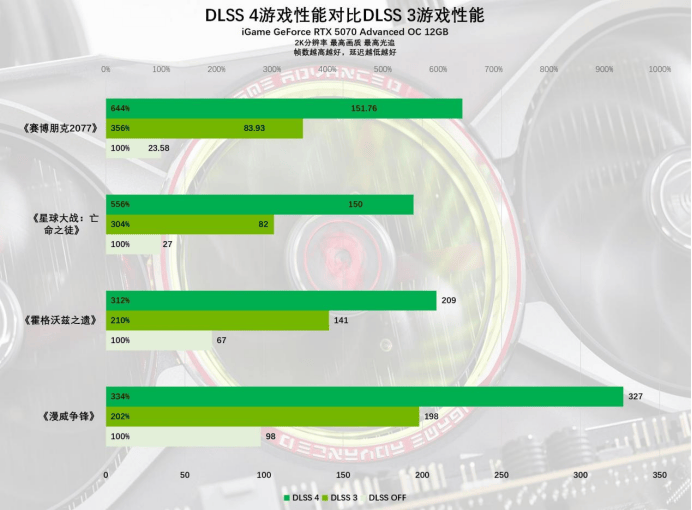 接下来,我们精心挑选了四款支持DLSS 4技术的游戏,以评估iGame RTX 5070 Advanced OC 12GB在实际游戏中的性能表现。总体而言,DLSS 4的多帧生成功能无疑显著提升了玩家的游戏体验。与前一代RTX 40系列的DLSS 3技术相比,DLSS 4进一步显著提高了帧数表现。在保持一致的画质设置下,iGame RTX 5070 Advanced OC 12GB的性能提升极为突出,在我们测试的四款游戏中,启用DLSS 4后的流畅度几乎是RTX 4070的两倍!这一成就并非仅仅依赖于硬件的堆砌,而是通过“科技与巧妙的技术”所实现的。