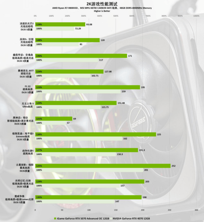 在实际测试中,iGame RTX 5070 Advanced OC 12GB在2K分辨率下轻松应对了大多数游戏。得益于DLSS技术的加持,它能够轻松满足2K@160Hz的电竞级显示需求。当然,如果你偏好在游戏设置中开启全高特效和全景光线追踪,例如在《黑神话:悟空》这类对显卡要求极高的游戏中,游戏的流畅度可能会受到影响。不过,你可以适当降低游戏设置,或者将DLSS模式切换到性能模式,这样就能享受到更流畅的游戏体验。值得一提的是,随着《黑神话:悟空》未来支持DLSS 4技术,帧数的提升将更为显著。在性能对比上,在11款游戏中,iGame RTX 5070 Advanced OC 12GB相较于上一代RTX 4070,性能提升了约30.8%,这一提升是相当显著的。
