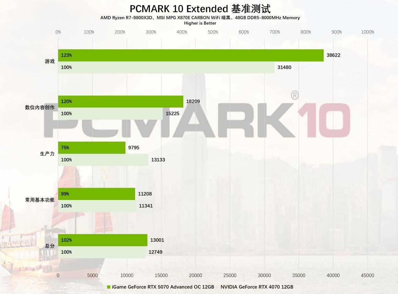 游戏性能的展示已经落下帷幕,现在让我们转向创作者们更为关注的生产力性能。在PCMark10 Extended测试中,iGame RTX 5070 Advanced OC 12GB在游戏和数字内容创作方面的表现格外亮眼,相较于RTX 4070,其性能提升了大约23%和20%。然而,在生产力测试方面,其得分低于预期,这可能是因为当前驱动程序和软件优化尚未达到最佳状态。