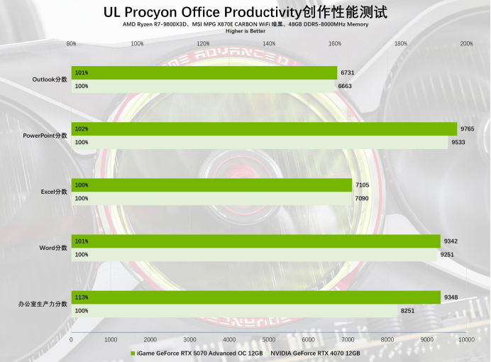 在办公软件的测试环节中,iGame RTX 5070 Advanced OC 12GB与RTX 4070的表现相差无几。实际上,使用这种级别的显卡,用户通常不会过分关注其在办公软件中的运行速度,因为日常办公软件的应用负载相对较轻。