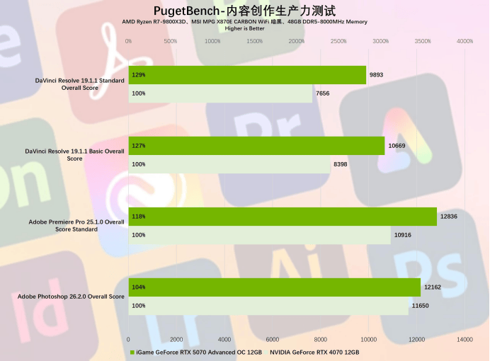 在进行平面设计和视频测试时,我们对UL Procyon和PugetBench这两个不同的基准测试工具进行了评估,得出的结果大致相同。iGame RTX 5070 Advanced OC 12GB在视频基准测试中的表现令人瞩目,这主要归功于新一代GeForce RTX 5070编码器的进一步优化。因此,在达芬奇和Premiere Pro的测试中,iGame RTX 5070 Advanced OC 12GB相较于前一代的RTX 4070,性能领先约17%~29%,这一差距是相当显著的。