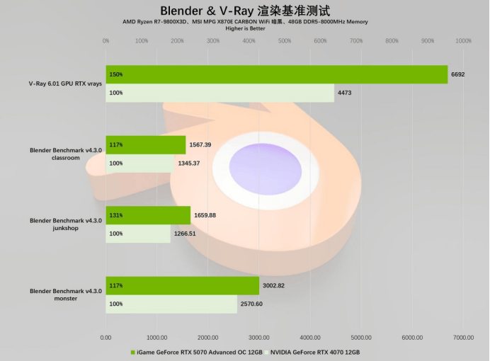 我们将目光转向3D渲染和工业设计软件,探索RTX 50系列显卡所带来的卓越性能。在这些领域中,我们熟悉的合作伙伴Blender和V-Ray,iGame RTX 5070 Advanced OC 12GB显卡的表现令人瞩目,它在性能上大幅超越了RTX 4070。