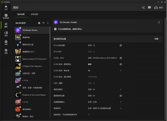 接下来,我们关注更为专业的D5 Render渲染器,这是一款基于DXR和光线追踪技术构建的GPU渲染器。得益于光线追踪技术,D5 Render渲染出的画面质量极为出色。在RTX 40系列显卡测试中,该软件支持了DLSS 3帧生成技术。随着RTX 50系列显卡的推出,D5 Render现在也可以通过NVIDIA App支持最新的DLSS 4多帧生成功能。