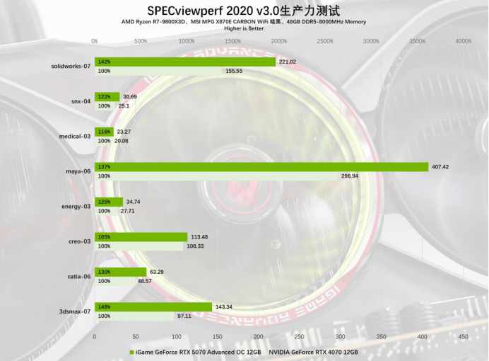 在工业设计领域,SPEC2020测试能够体现显卡的性能。在多项测试中,iGame RTX 5070 Advanced OC 12GB显卡同样表现出色,与RTX 4070相比,平均性能提升了28%。