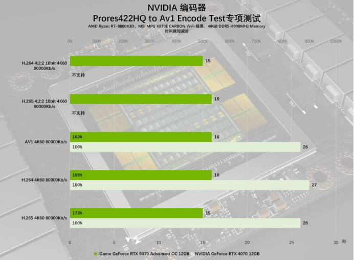 于是我们直接使用NVIDIA提供的4K60片源与工程文件分别测试AV1、H.265以及H.264下的编码导出时间。实测同一段素材下,iGame RTX 5070 Advanced OC 12GB导出三段视频的时间分别是16秒、16秒以及15秒,效率提升已经是超级明显了。