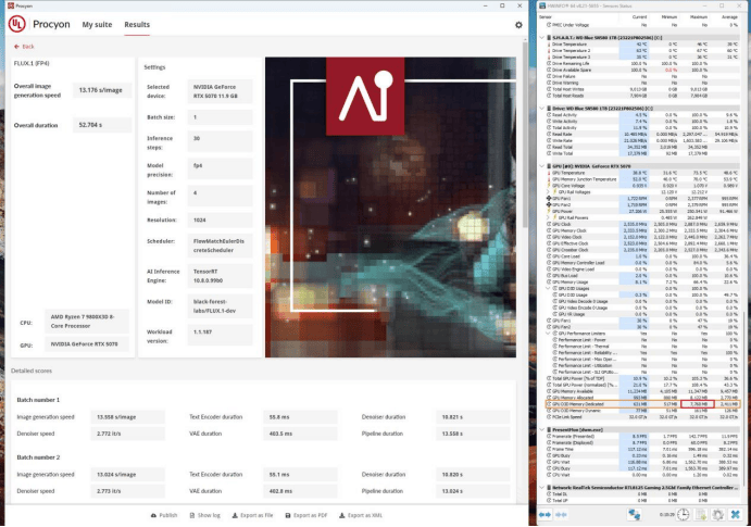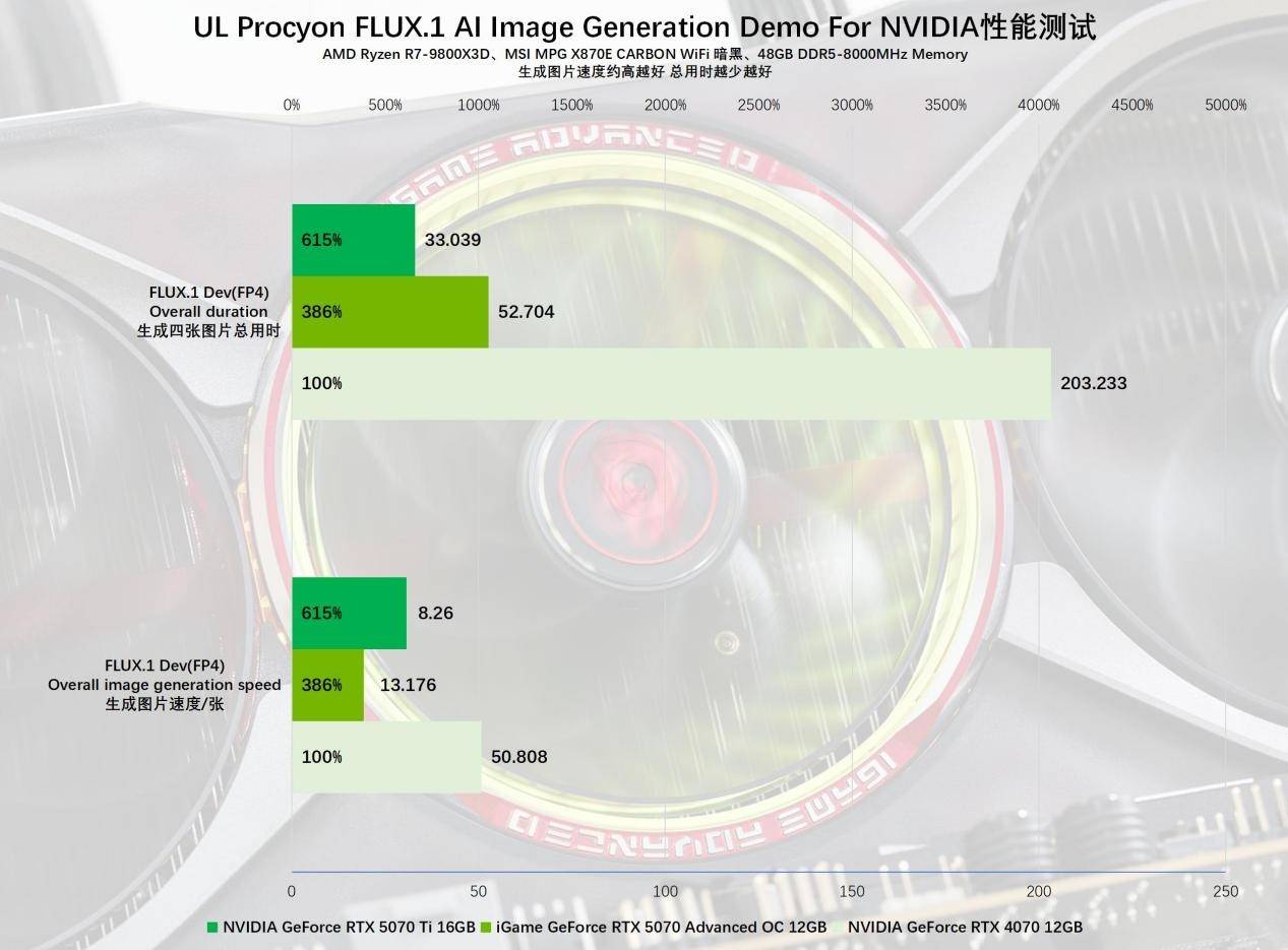通过使用UL Procyon测试版本FLUX.1 AI Image Generation Demo For NVIDIA进行评估。在测试中,我们没有采用FP8精度模型,原因在于两款显卡在测试中均出现了显存溢出的问题,因此仅对FP4精度模型进行了评估。iGame RTX 5070 Advanced OC 12GB在生成图片的速度上达到了每张13.176秒,效率显著提升。