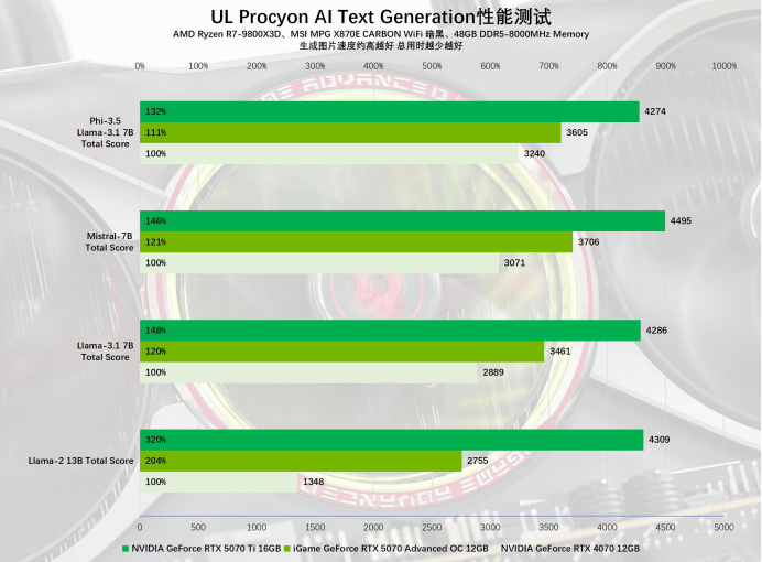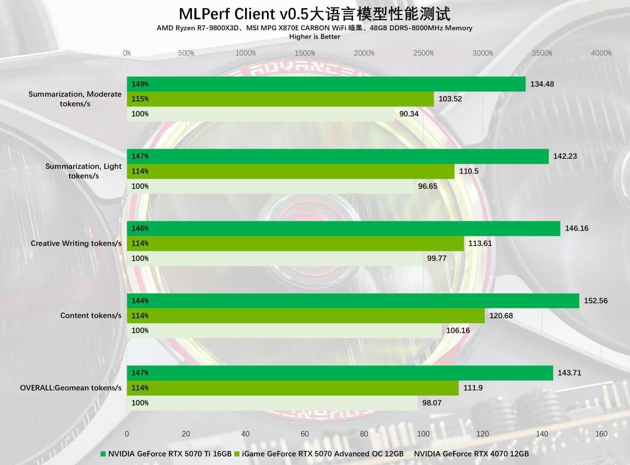 在AI文本生成的测试中,我们利用UL Procyon和MLPerf Client v0.5对大型语言模型进行了测试,结果显示iGame RTX 5070 Advanced OC 12GB在各项测试中均展现出了优异的性能。