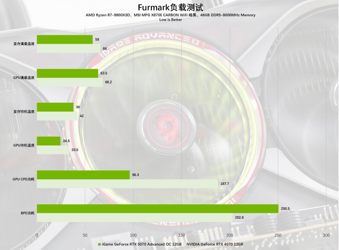 在与RTX 4070 FE显卡的温度与功耗对比中,iGame RTX 5070 Advanced OC 12GB在满载状态下的温度表现相当卓越,即便是高频的GDDR7显存颗粒的温度也得到了有效的控制。特别是显卡风扇在低温环境下几乎完全停止运转,结合之前提到的在高负载下的低噪音表现,这款显卡在温度和噪音控制方面确实表现出色。
