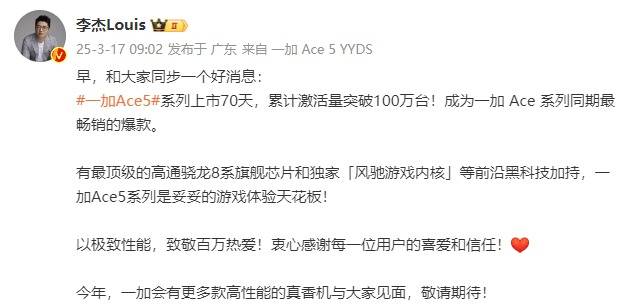 — 一加 Ace 5系列激活量突破100万台,以极致性能,致敬百万热爱! —